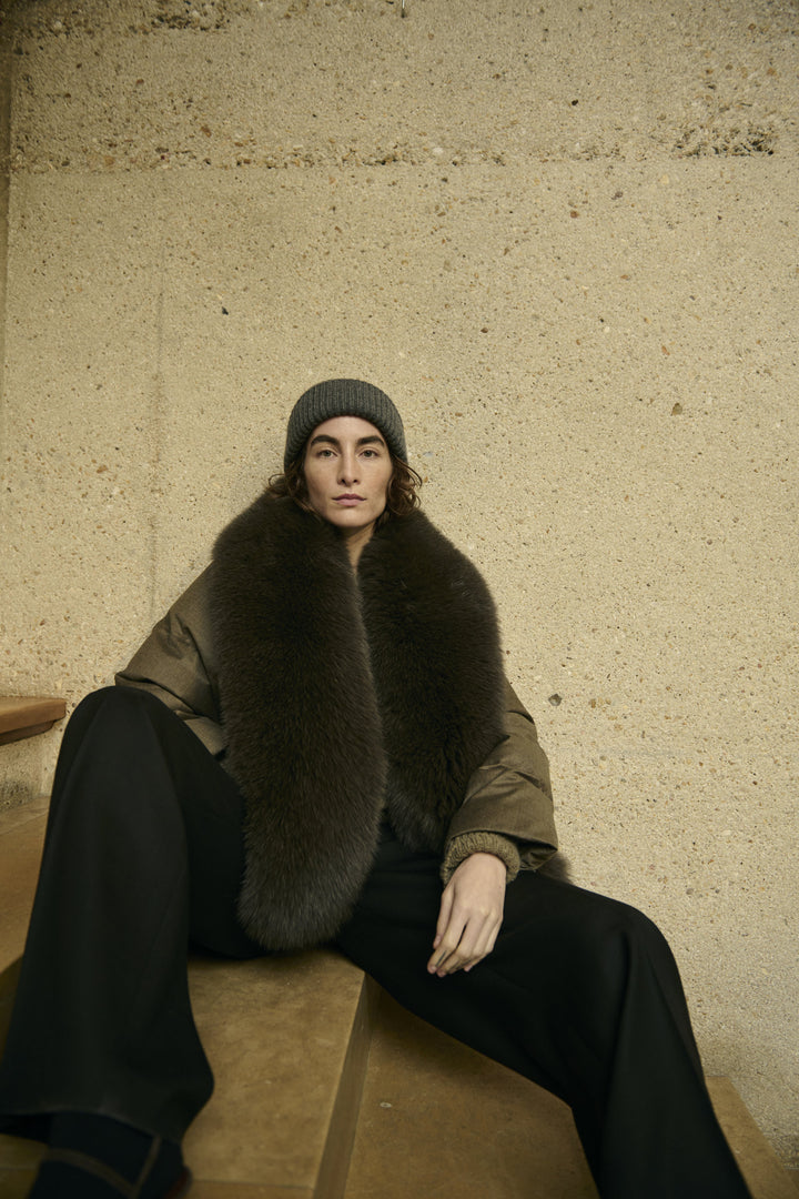 The Yves Salomon collection features sophisticated black puffer coats in various silhouettes, from our iconic "A" line jackets with fox fur collars to technical fabric parkas with mink fur lining, all offering elegant protection against winter's chill.