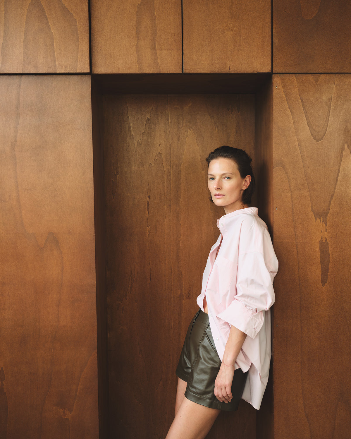 Office polish: Pair straight-leg or wide-leg leather trousers with a silk blouse in ivory or soft grey, then layer a tailored wool blazer over the top. Finish with loafers or pointed-toe flats for refined authority without stiffness.