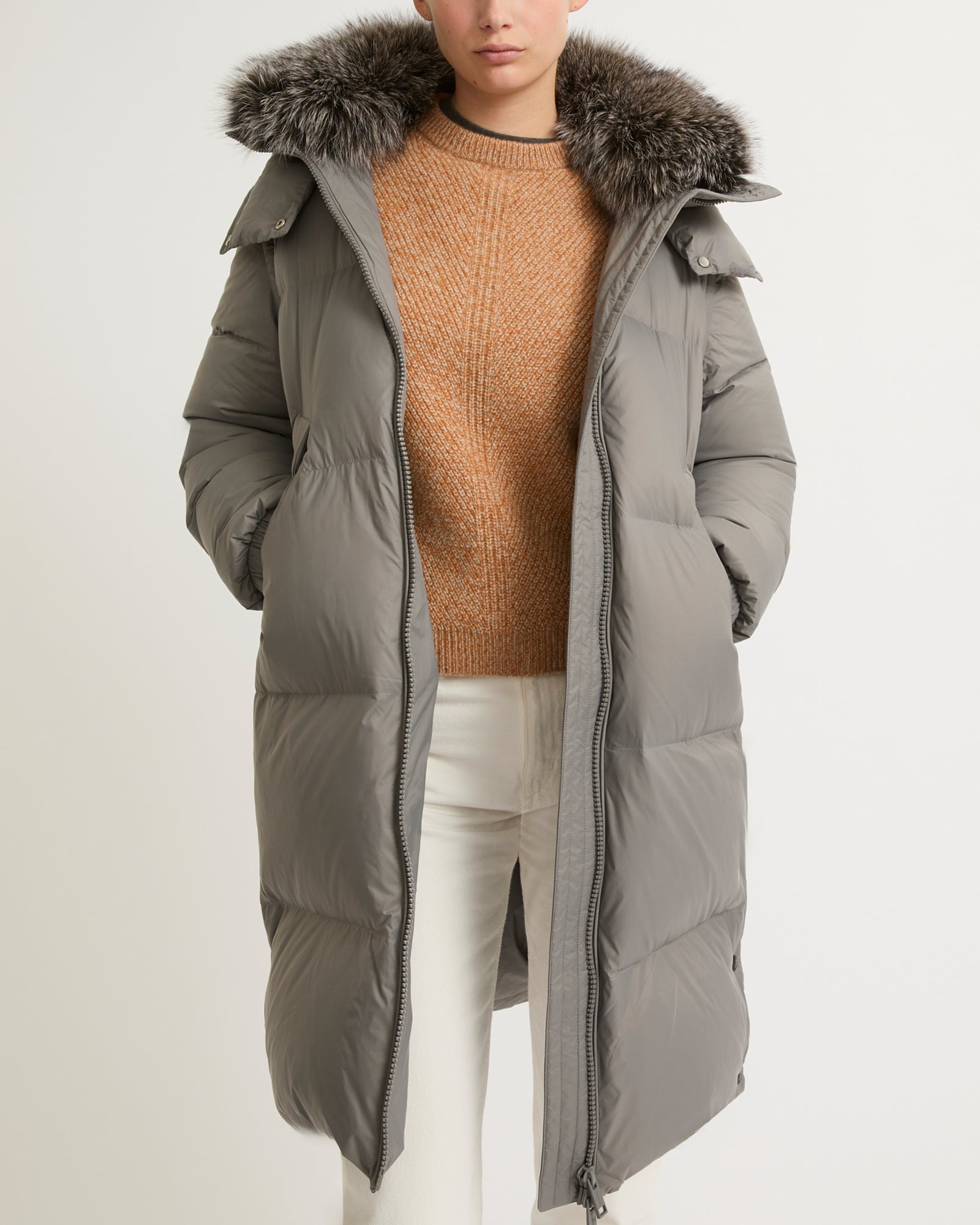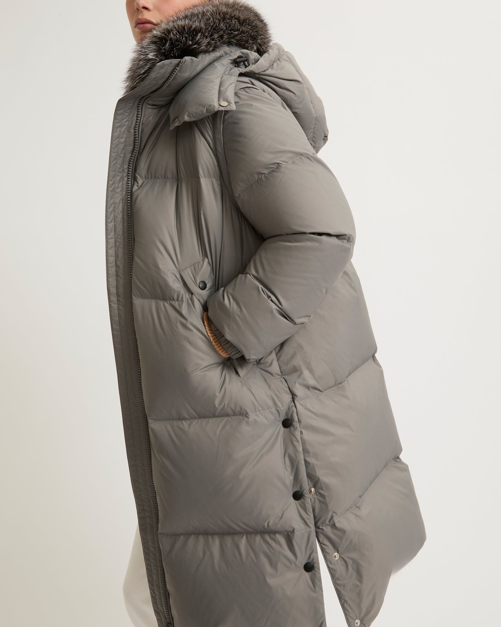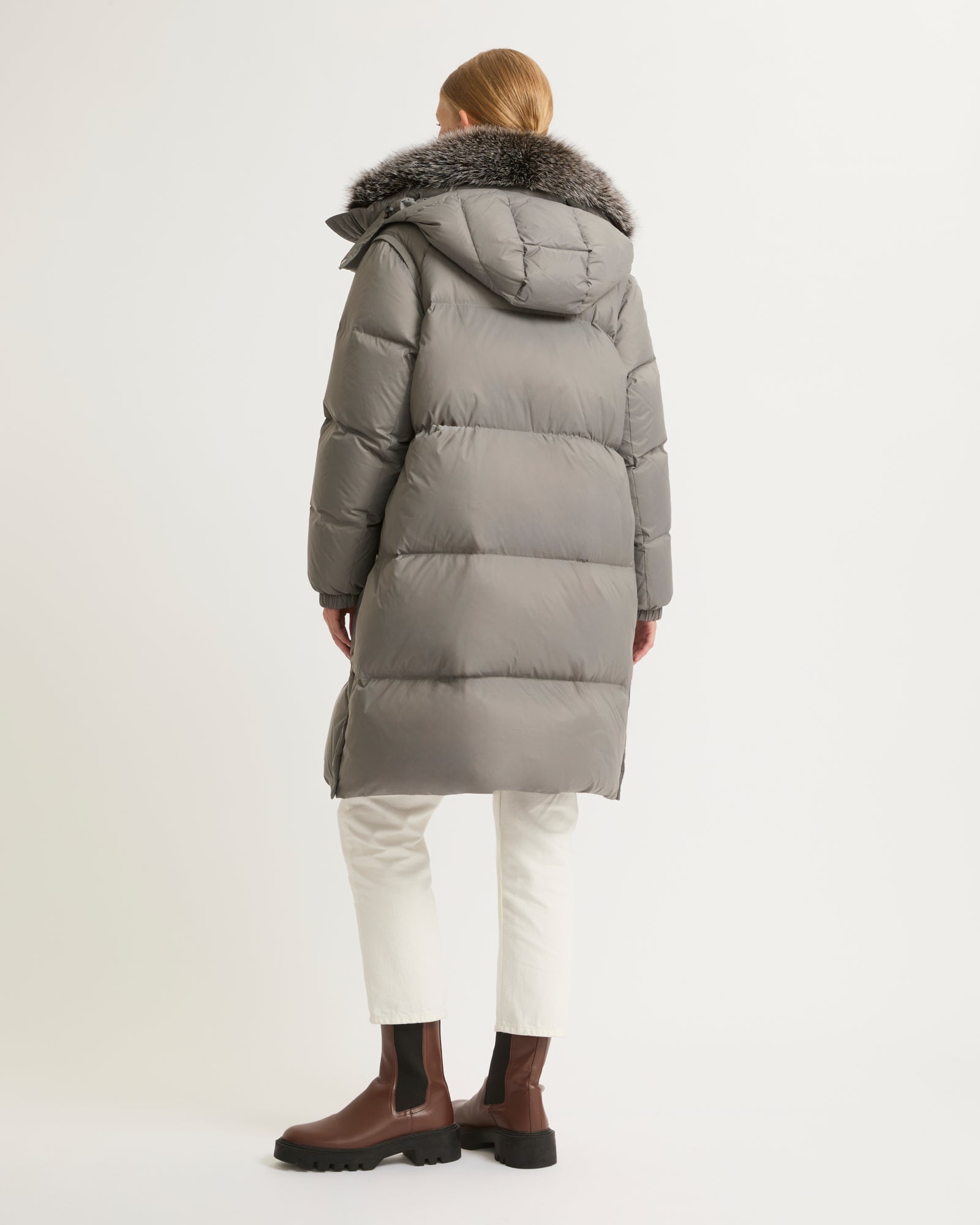 Perfectly suited to the coldest weather, this down jacket combines the technical qualities of a water-repellent fabric and down lining with the warmth and elegance of a detachable fox fur collar. A hood also detachable offers further protection against the elements. This knee-length piece is especially versatile due to removable sleeves which allow it to be worn as a gilet, and it can be cinched using drawstring at the waist. Two large pockets welcome cold hands.