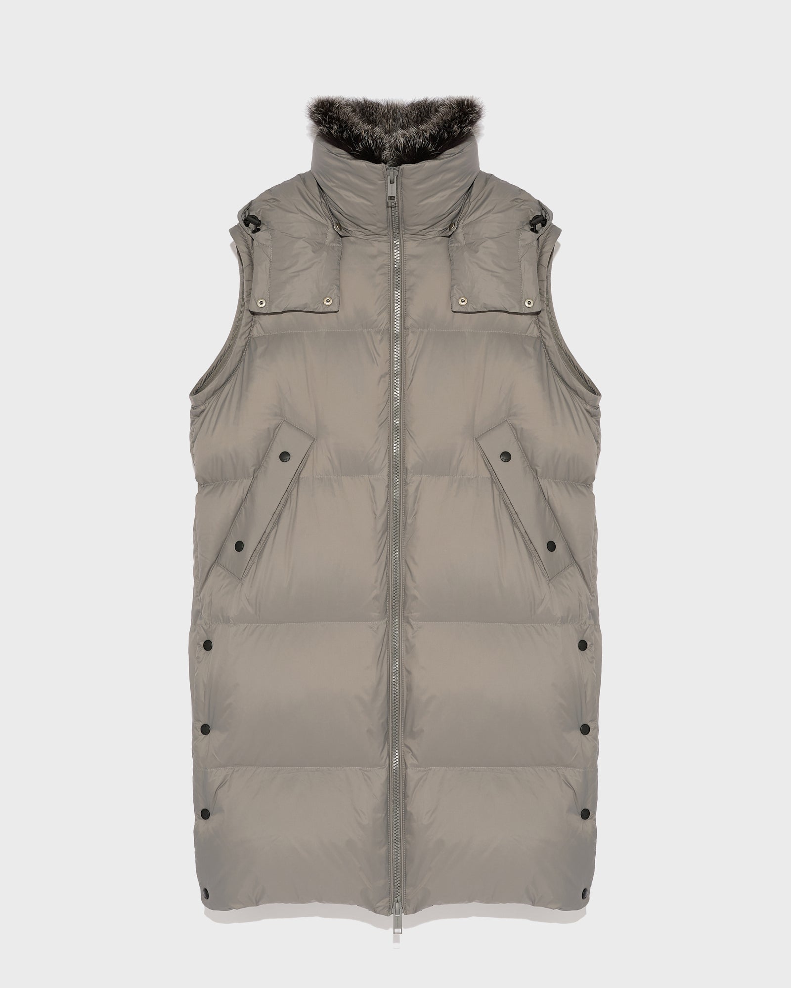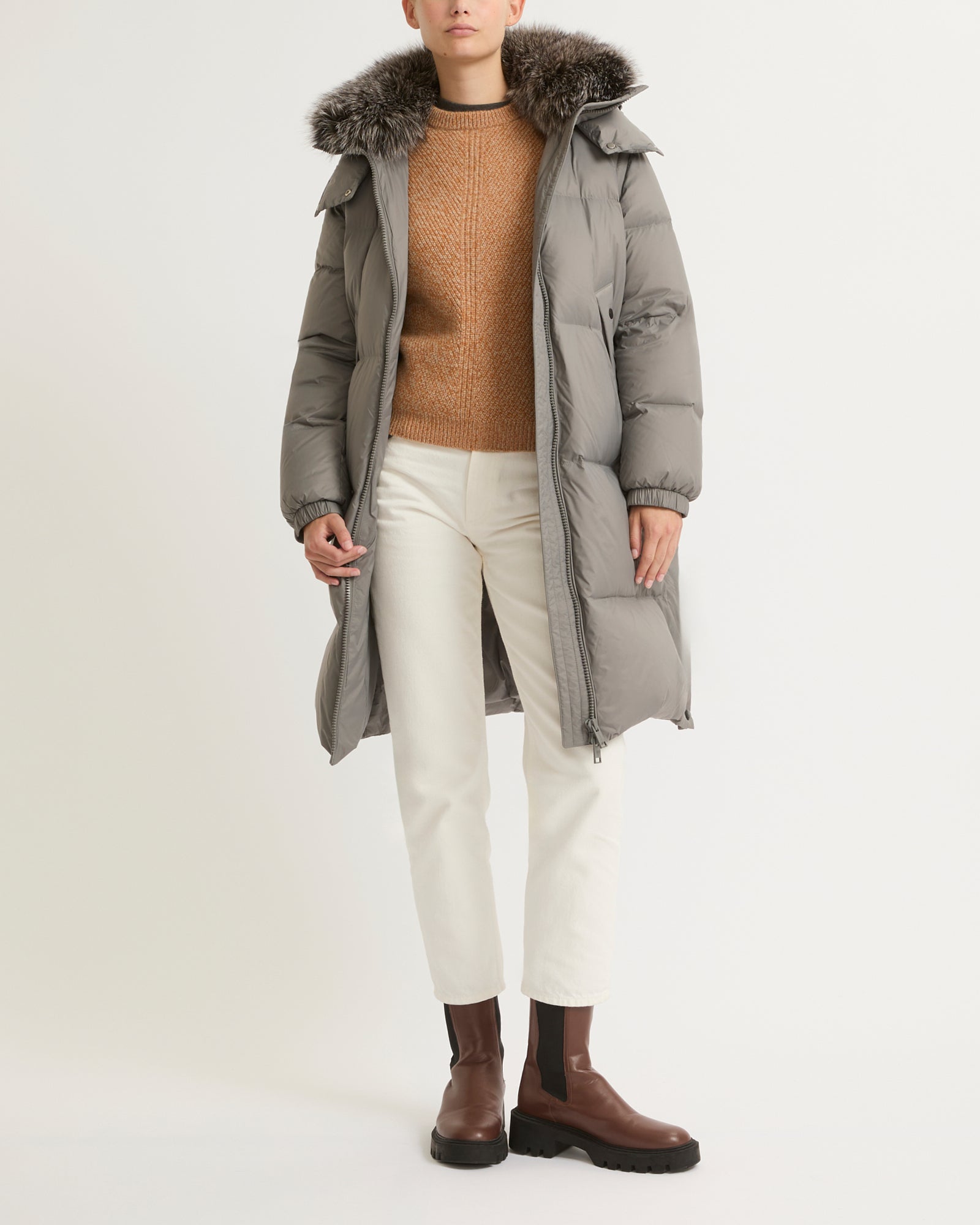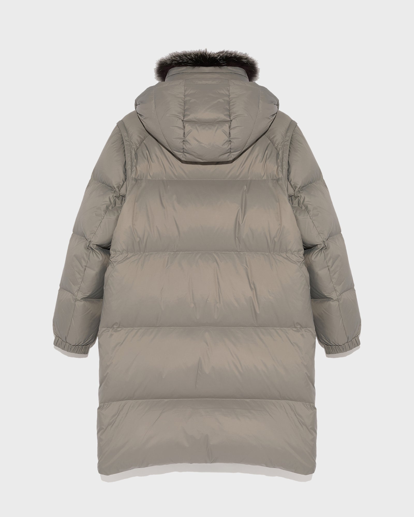 Perfectly suited to the coldest weather, this down jacket combines the technical qualities of a water-repellent fabric and down lining with the warmth and elegance of a detachable fox fur collar. A hood also detachable offers further protection against the elements. This knee-length piece is especially versatile due to removable sleeves which allow it to be worn as a gilet, and it can be cinched using drawstring at the waist. Two large pockets welcome cold hands.