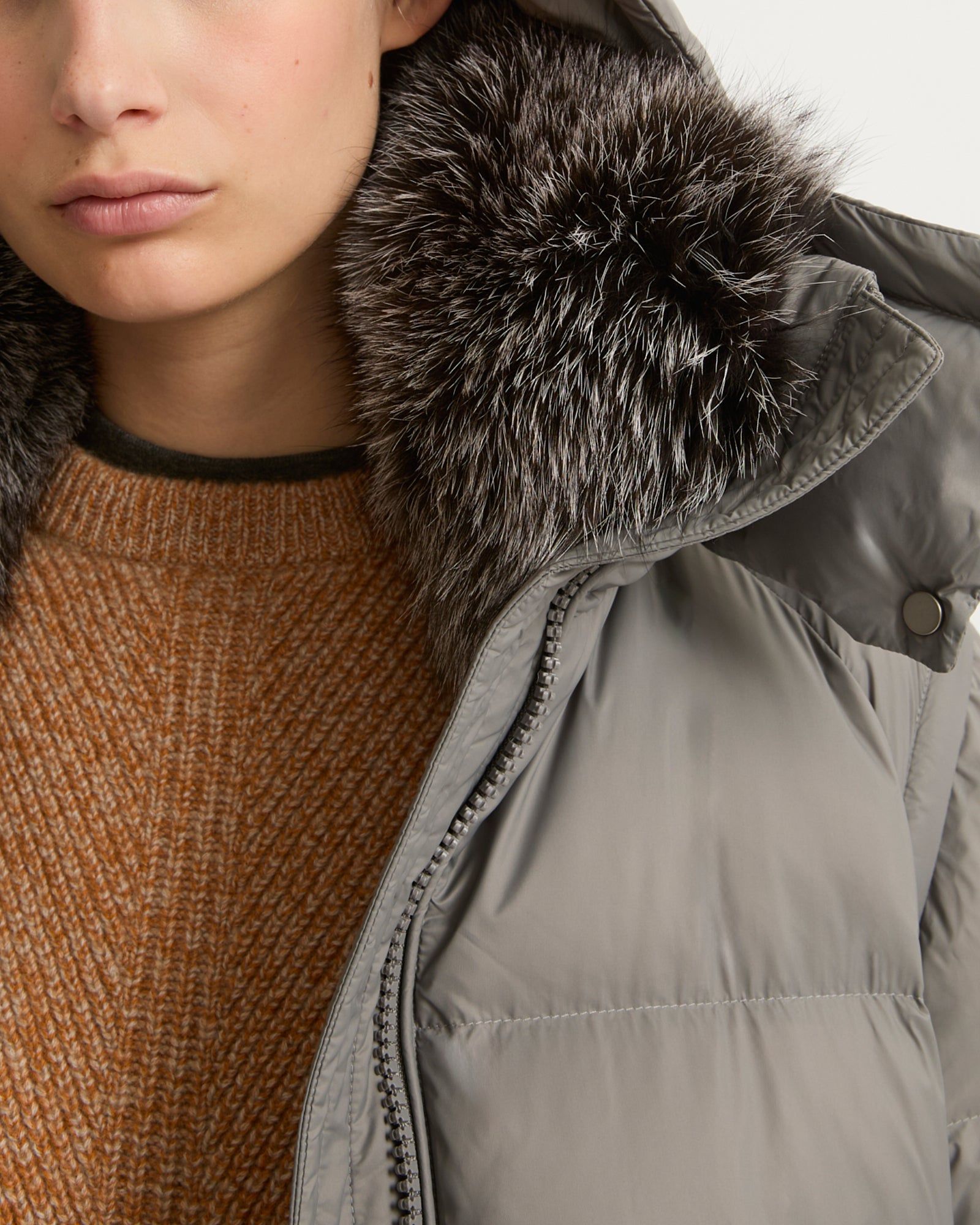 - Detachable collar trim in heather grey natural-dyed fox fur