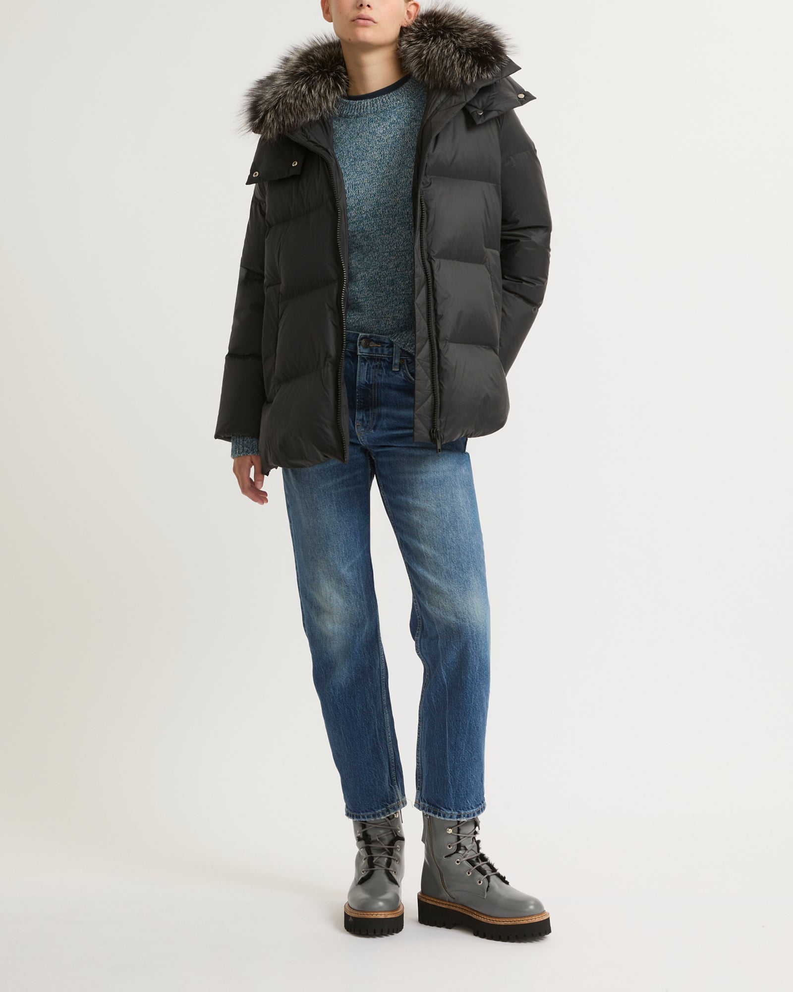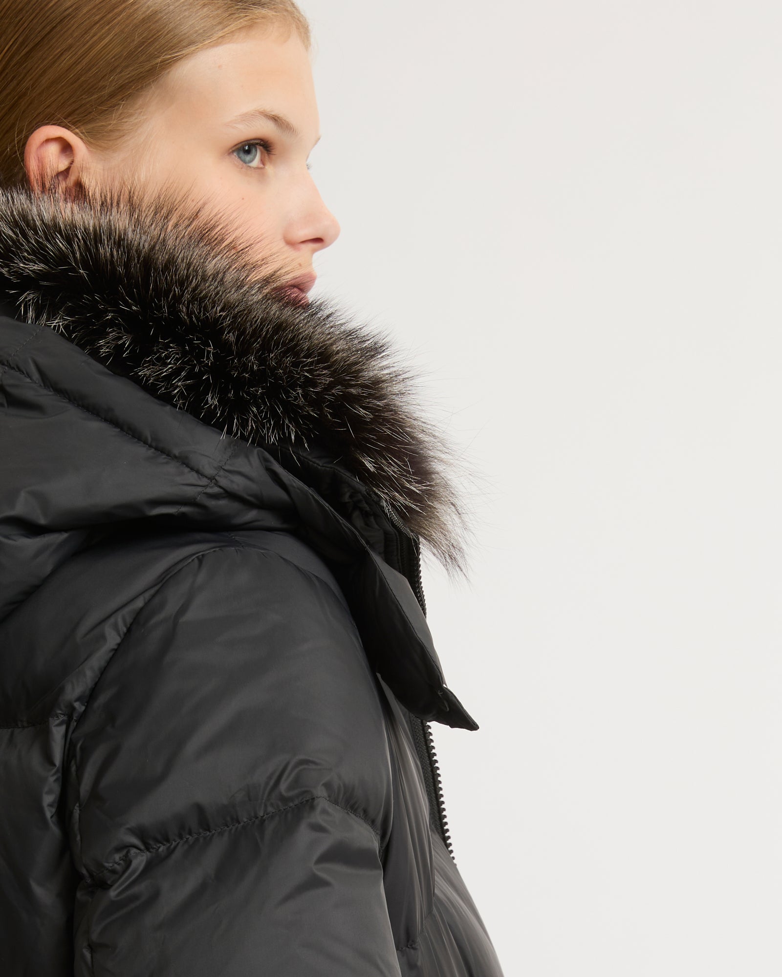 Crafted from water-repellent technical fabric, this iconic "A" line down jacket is padded with high-quality down and duck feathers for warmth and breathability. Design details include a front zip fastening, two welt pockets and invisible technical ribbed finishes at the bottom sleeves. Functional and lightweight at the same time, this model has side zip slits for extra ease and a touch of modernity. Featuring a detachable hood and a removable collar trim in natural-dyed fox, this versatile down jacket combines comfort with elegance.