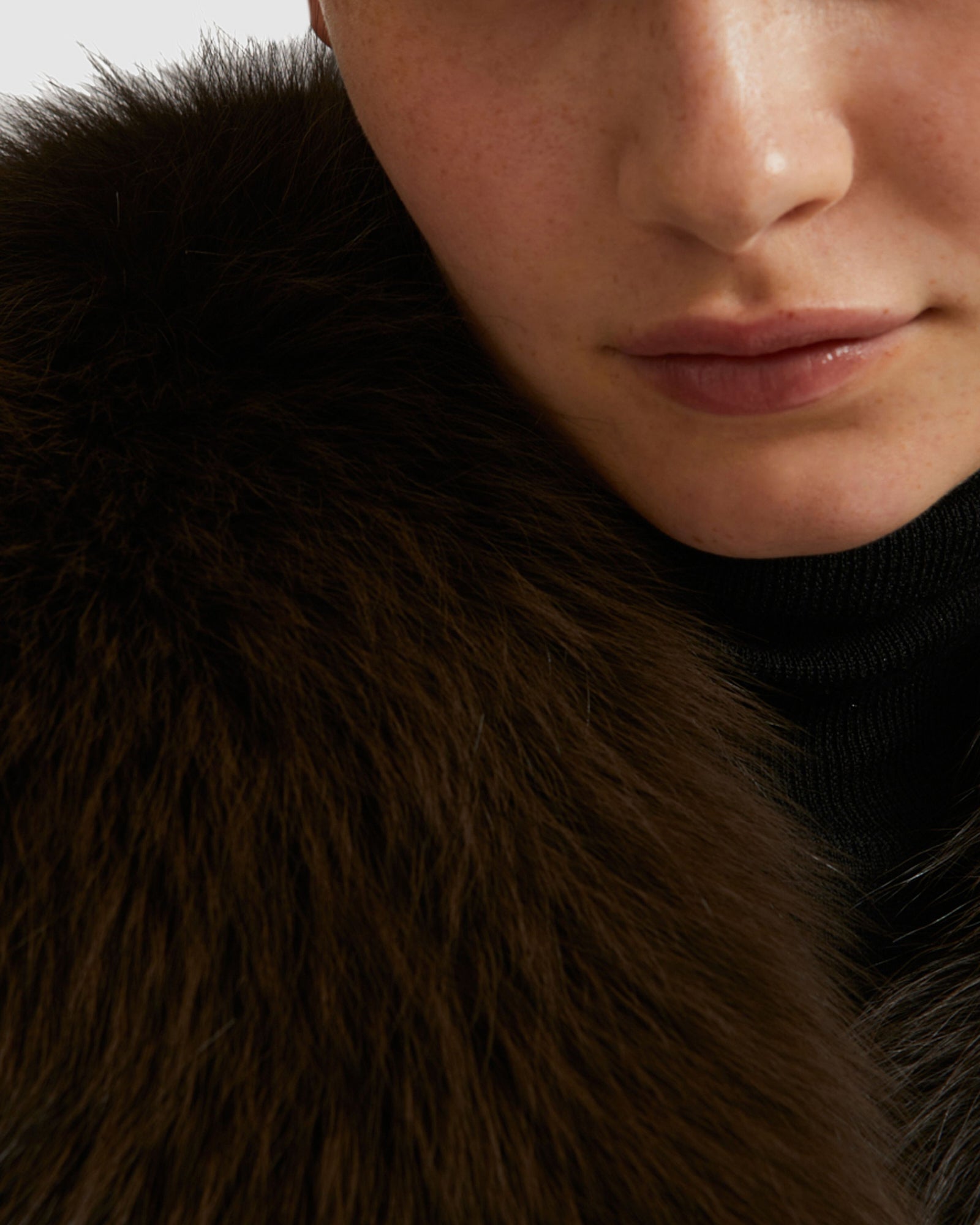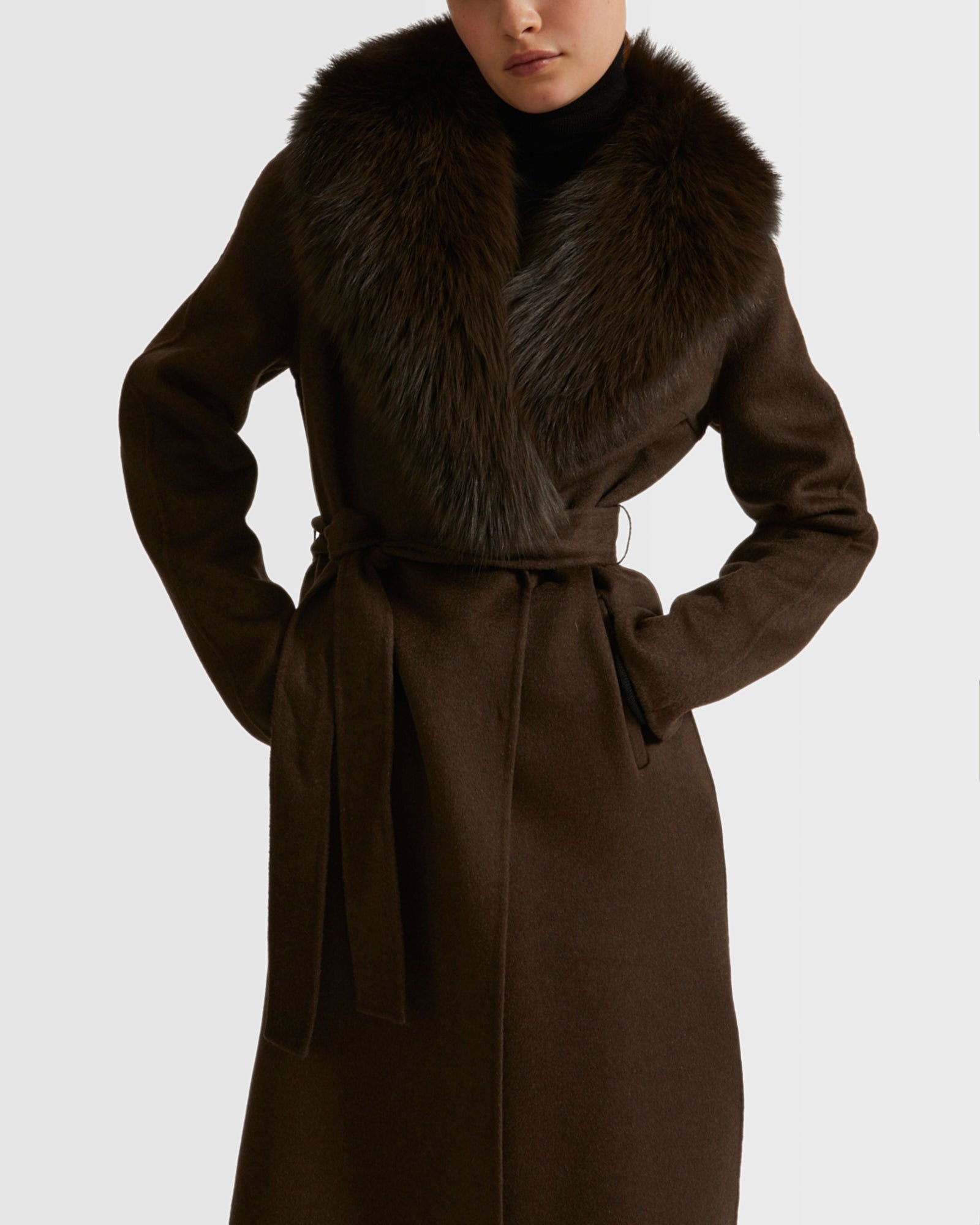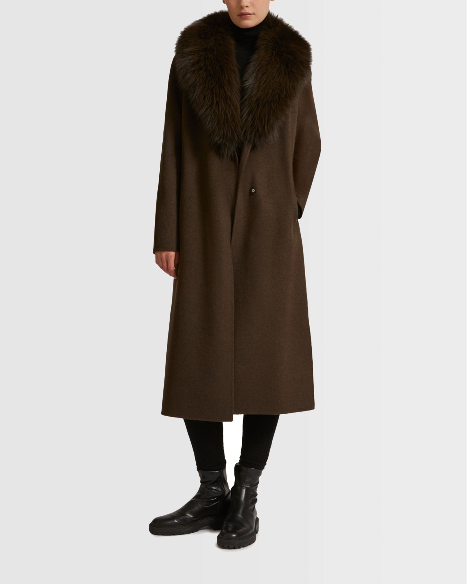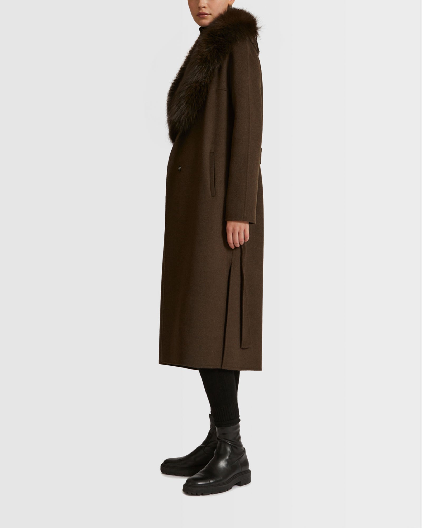 Made from unlined double-sided cashmere wool, this side-slit coat is enveloping yet lightweight and comfortable to wear. Featuring a tailored collar, two slit pockets and a single press-stud fastening, the masculine and pared back cut is adjustable thanks to the removable cashmere wool belt. For a versatile style and a touch of femininity, this model has a detachable fox fur collar and lapel. An elegant detail that makes all the difference and fastens perfectly to the coat using a concealed button system.