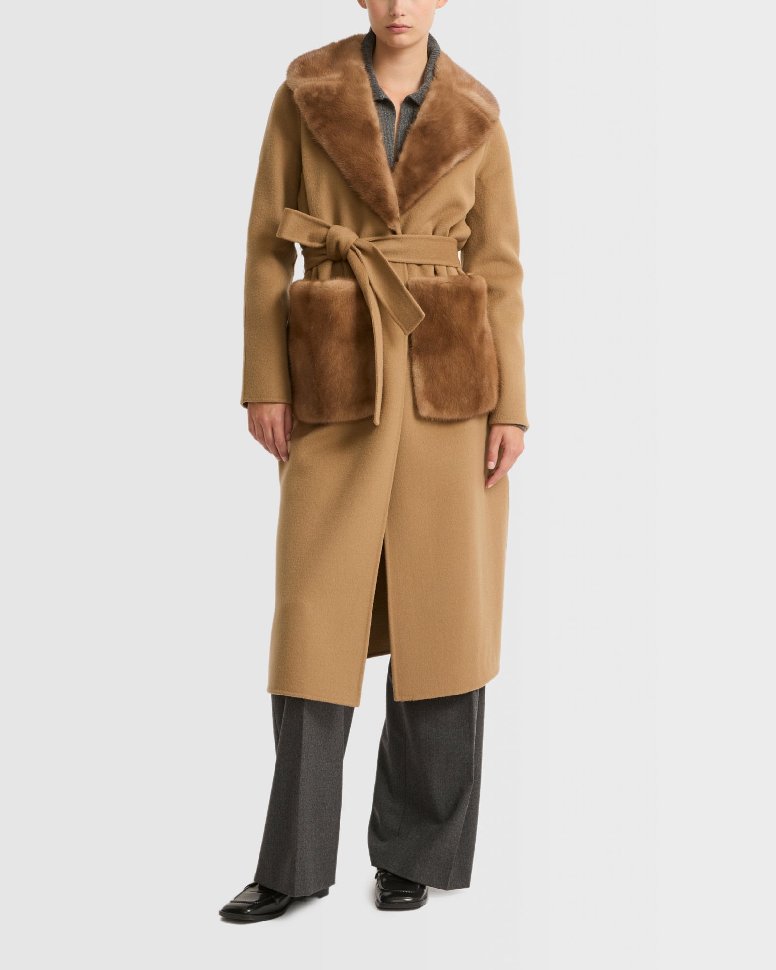 Long coat with side slits made from double-sided cashmere wool. Featuring a tailored collar, two patch pockets and a belt fastening to adjust the silhouette, this model plays with the masculine feminine codes. An evolving style thanks to removable mink fur collar and over-pockets. Elegant details that make all the difference and fasten perfectly to the coat using concealed button systems. A versatile and enveloping piece to suit every mood and temperature.