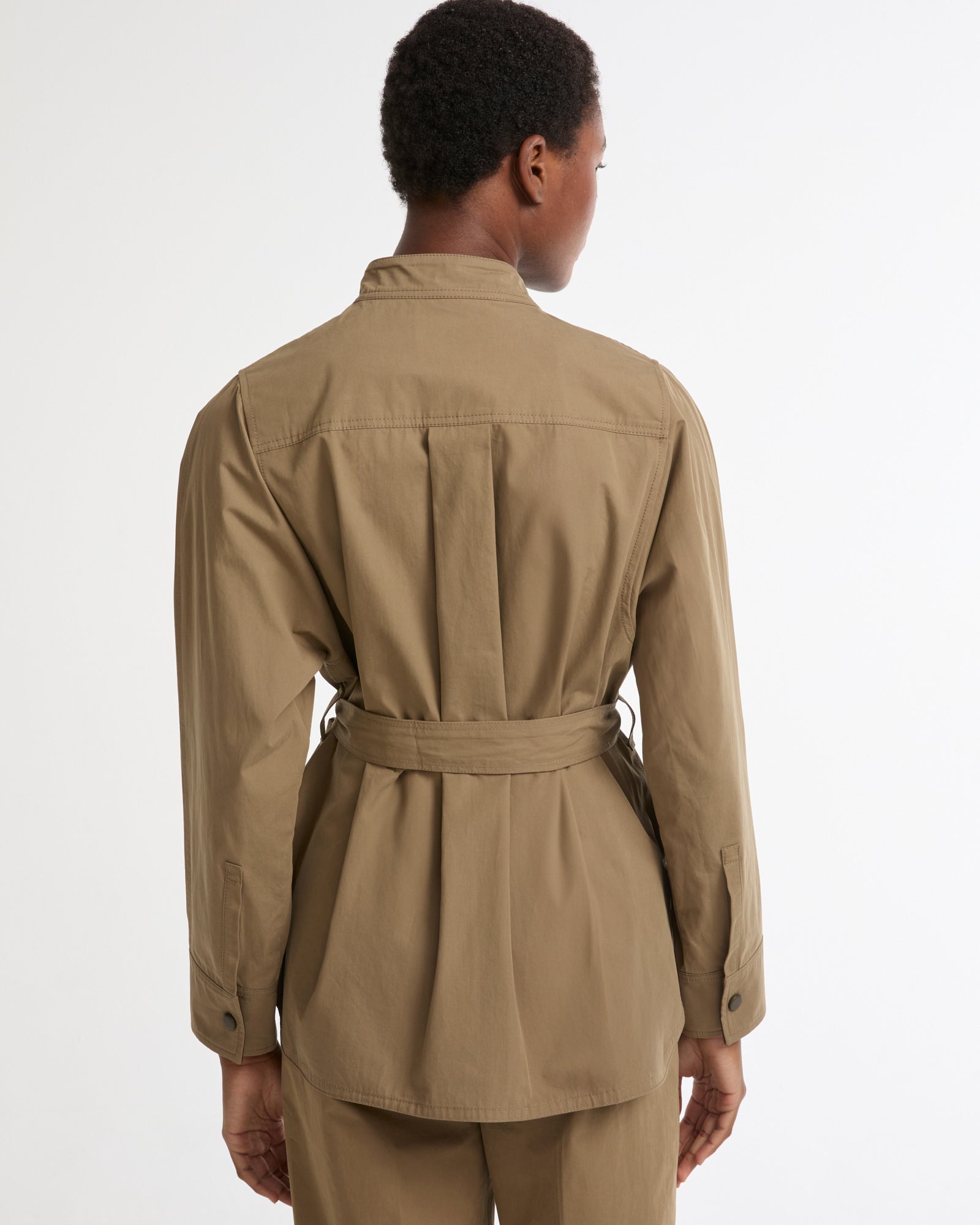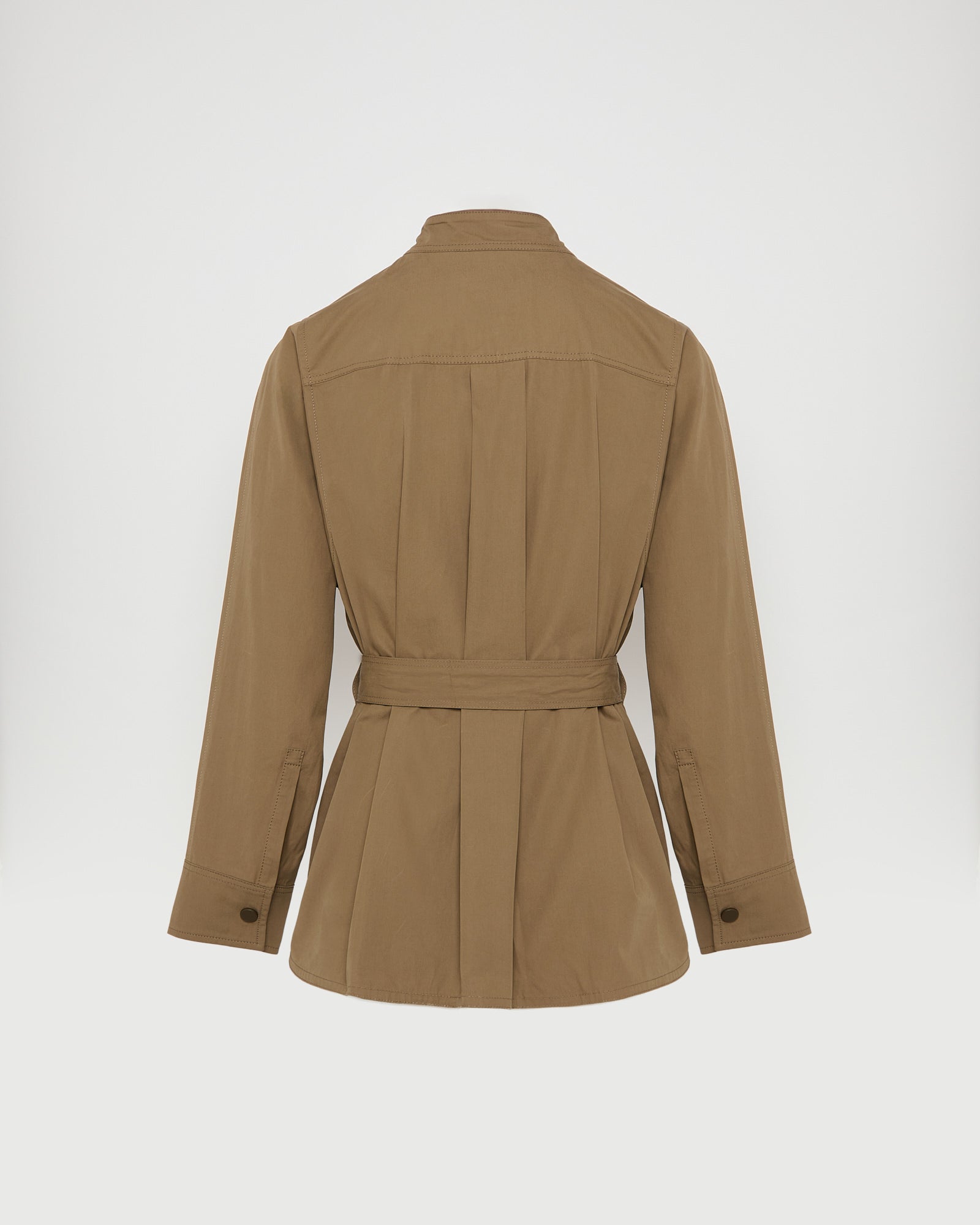 A safari-style jacket in flowing cotton, to be worn belted in order to highlight a clever play of pleats at the back. Details in lambskin leather on the pockets, collar, cuffs and buttons add an extra elegance to this statement piece.