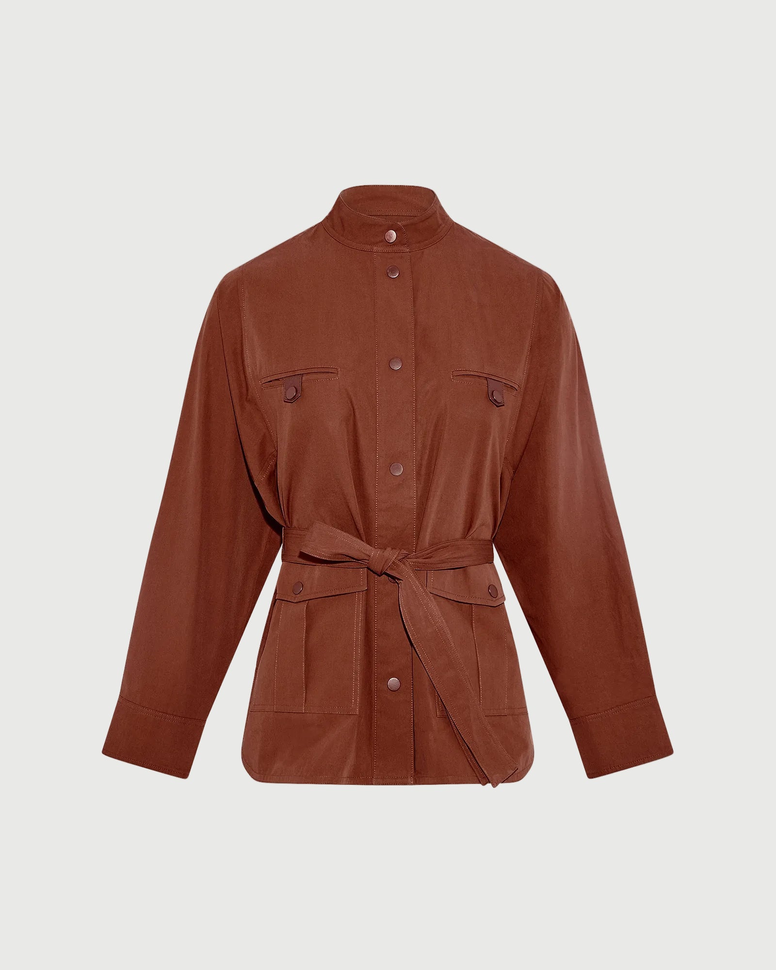 A safari-style jacket in flowing cotton, to be worn belted in order to highlight a clever play of pleats at the back. Details in lambskin leather on the pockets, collar, cuffs and buttons add an extra elegance to this statement piece.