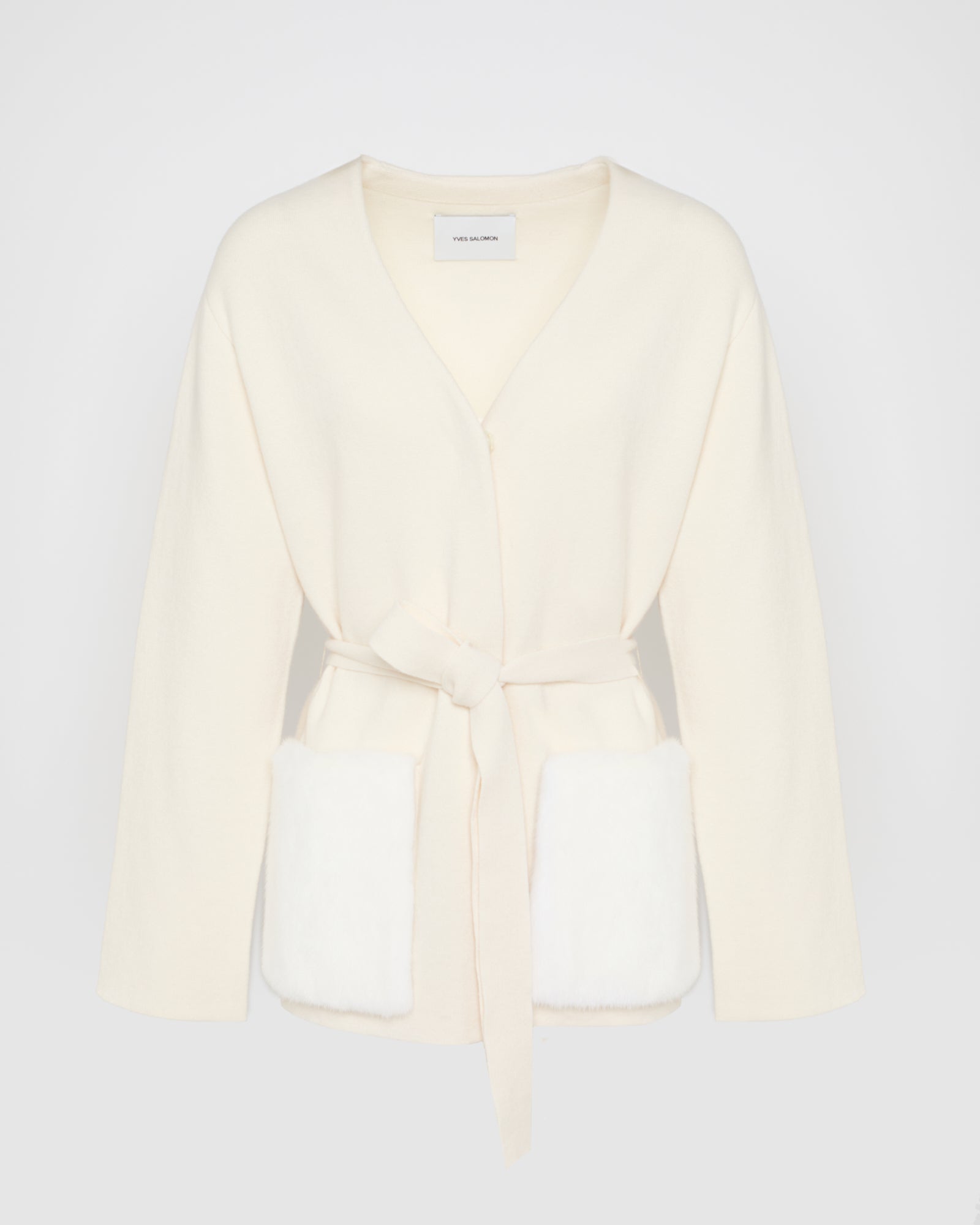 Providing a fluid, elegant silhouette, this collarless belted jacket opts for the perfect hang of a knit / mink association. Two large front pockets welcome the hands to finish off a look that this sophisticated yet relaxed.