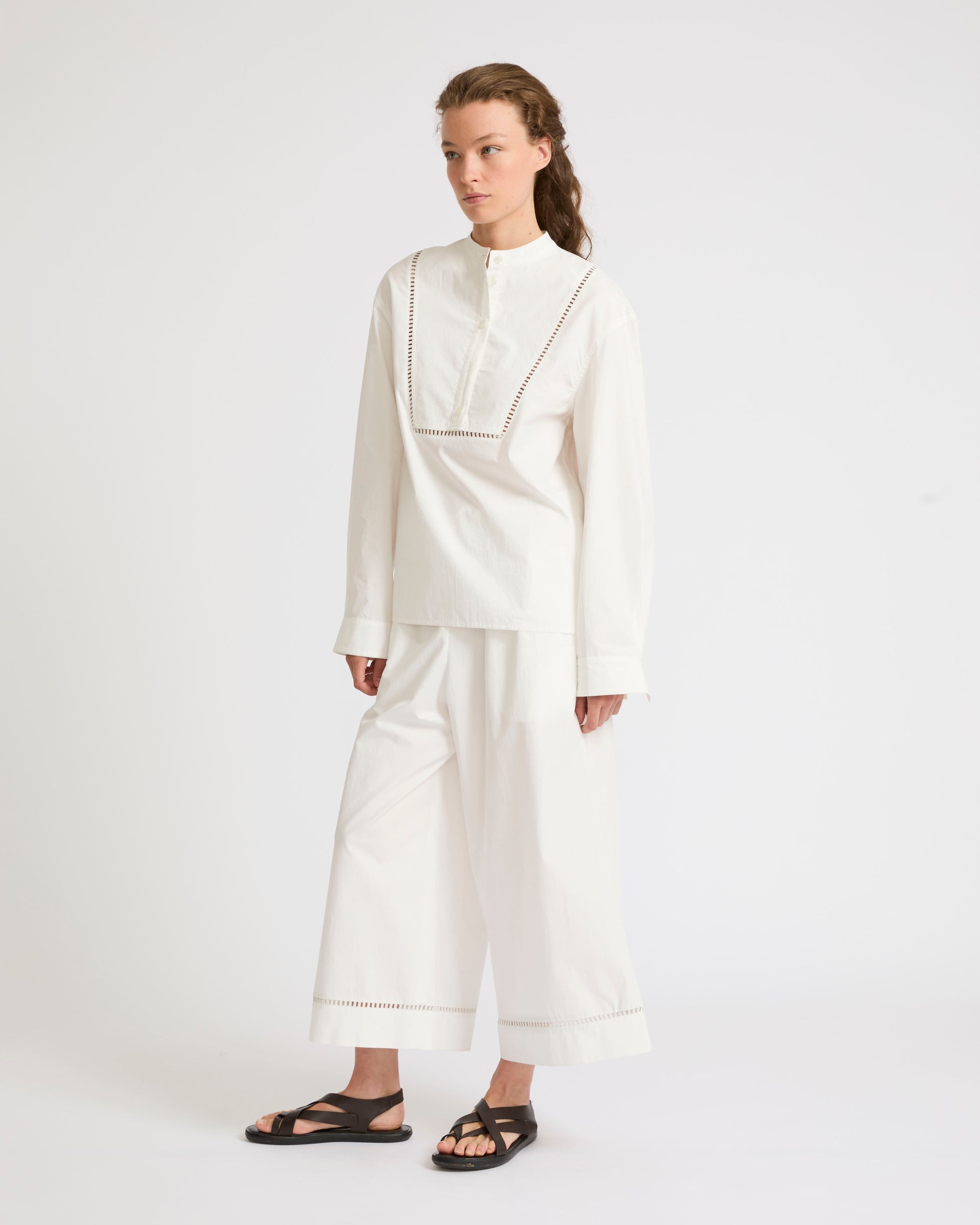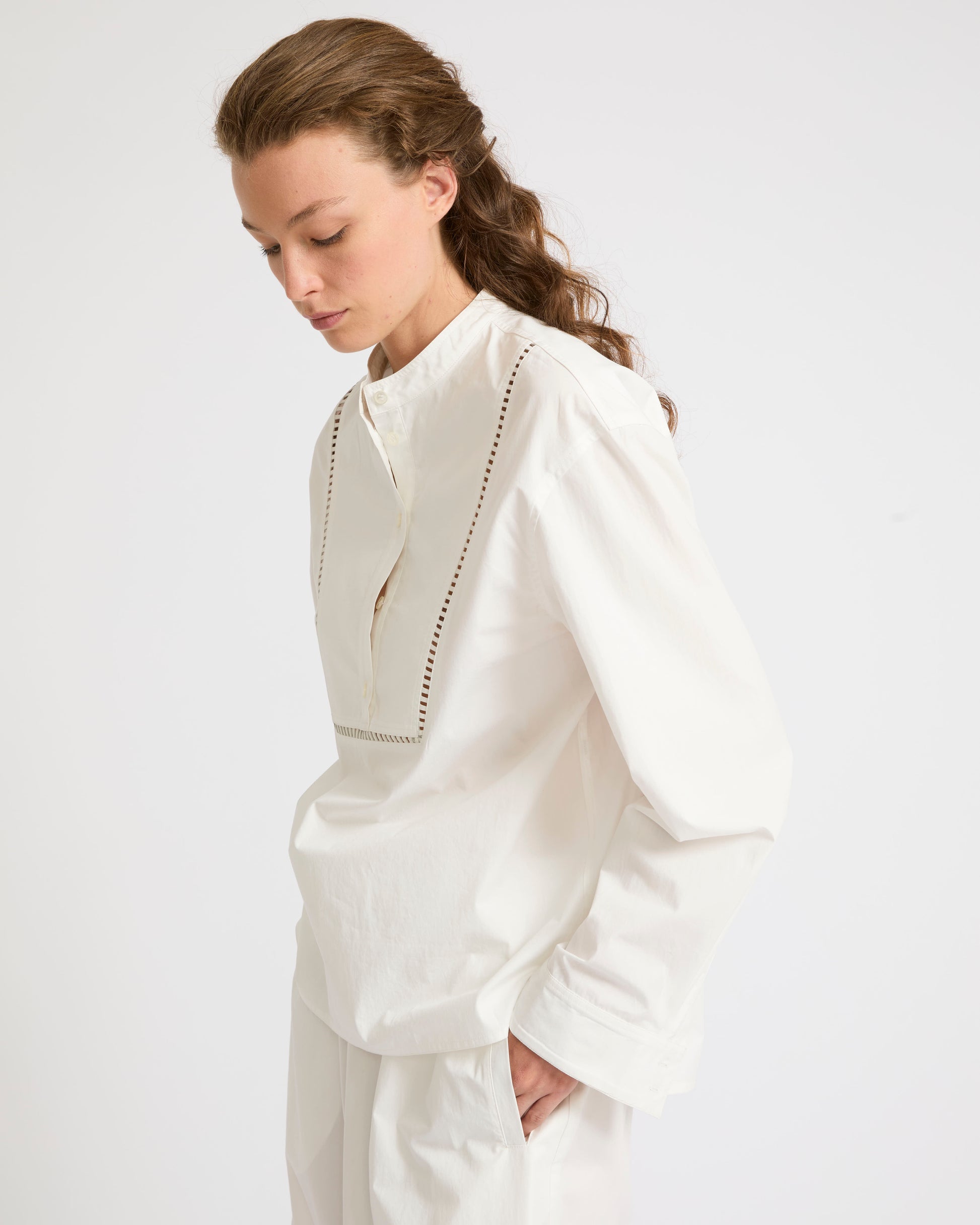 This crisp design with an oversized fit is inspired by the classic artists' smock. Leather embroidery details border the cotton poplin bib.