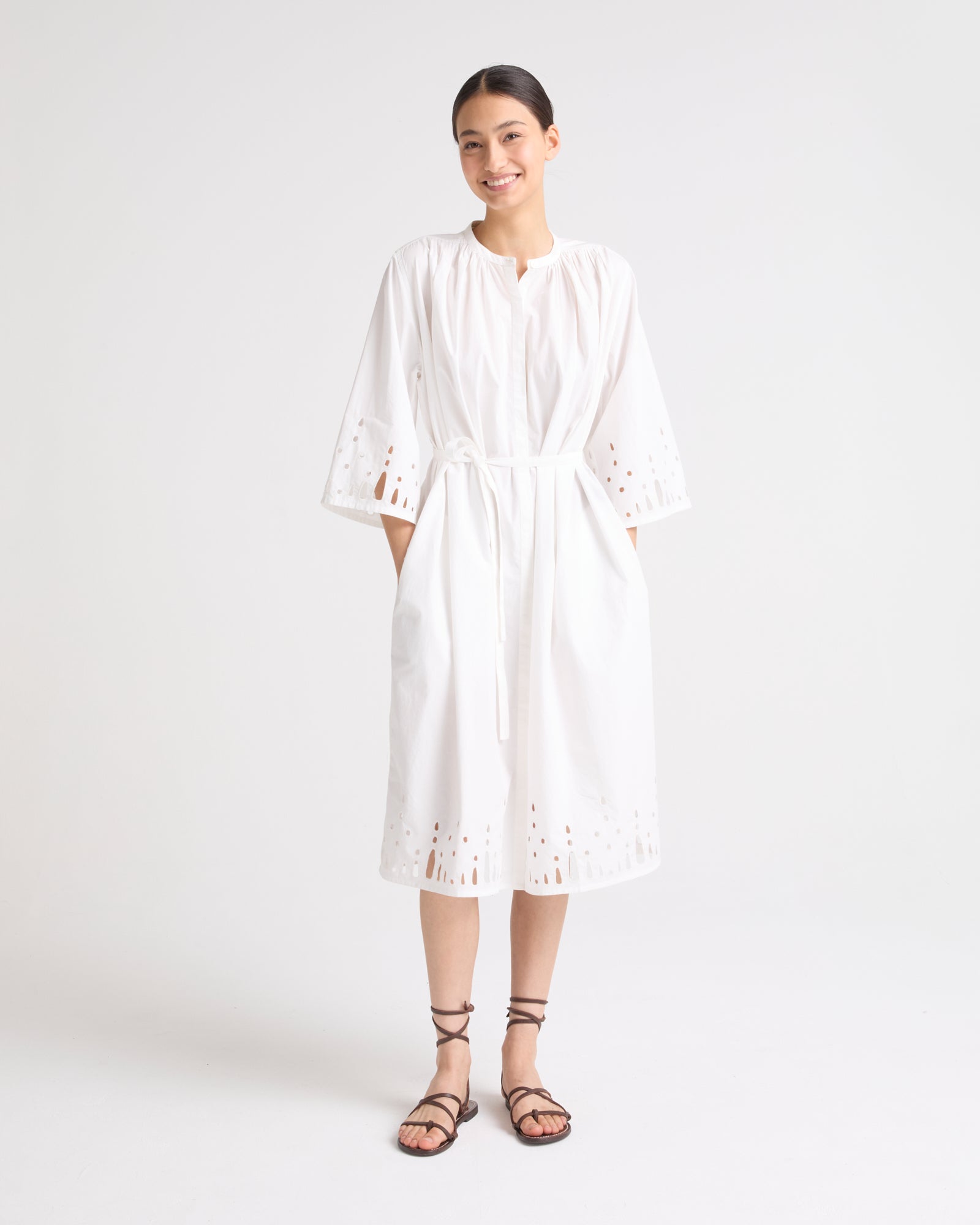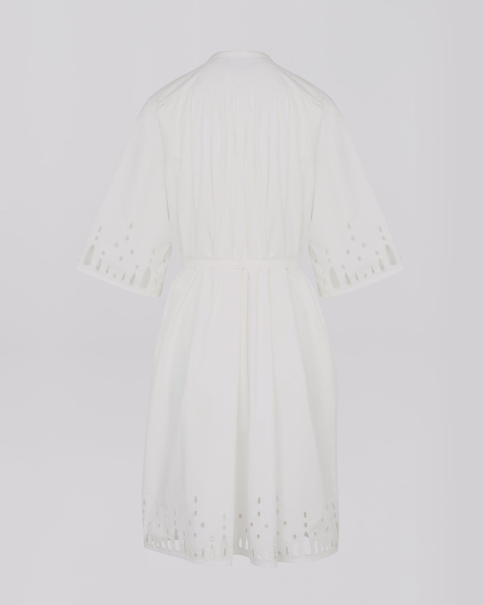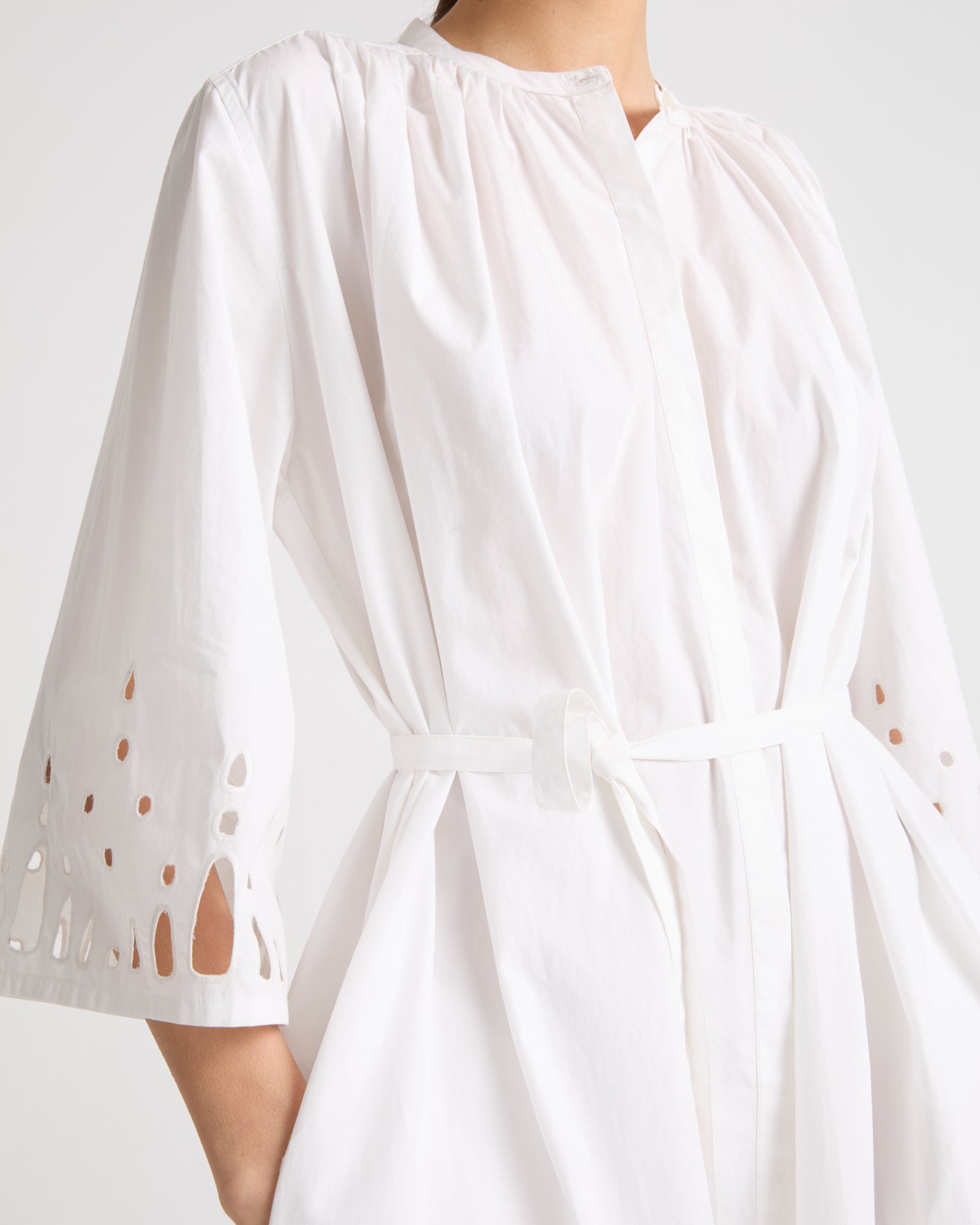 This long-sleeved dress in cotton poplin is versatile, featuring an officer collar, a draped bib and broderie anglaise-style cut-outs at the wrists and hem. Its generous cut can also be worn cinched.