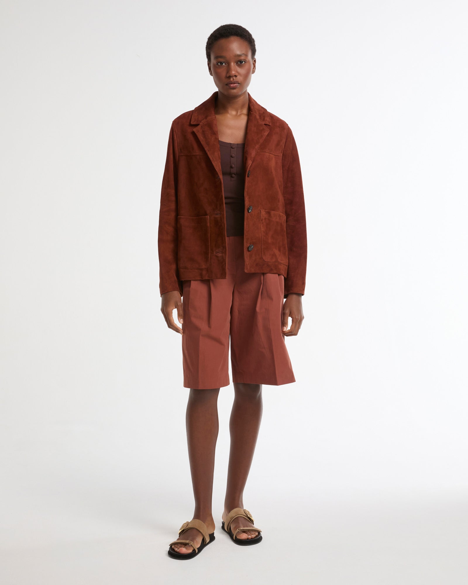 The suede-effect texture of double-sided lambskin provides an additional softness to this fluid jacket with a notched collar, to be worn alone or layered.