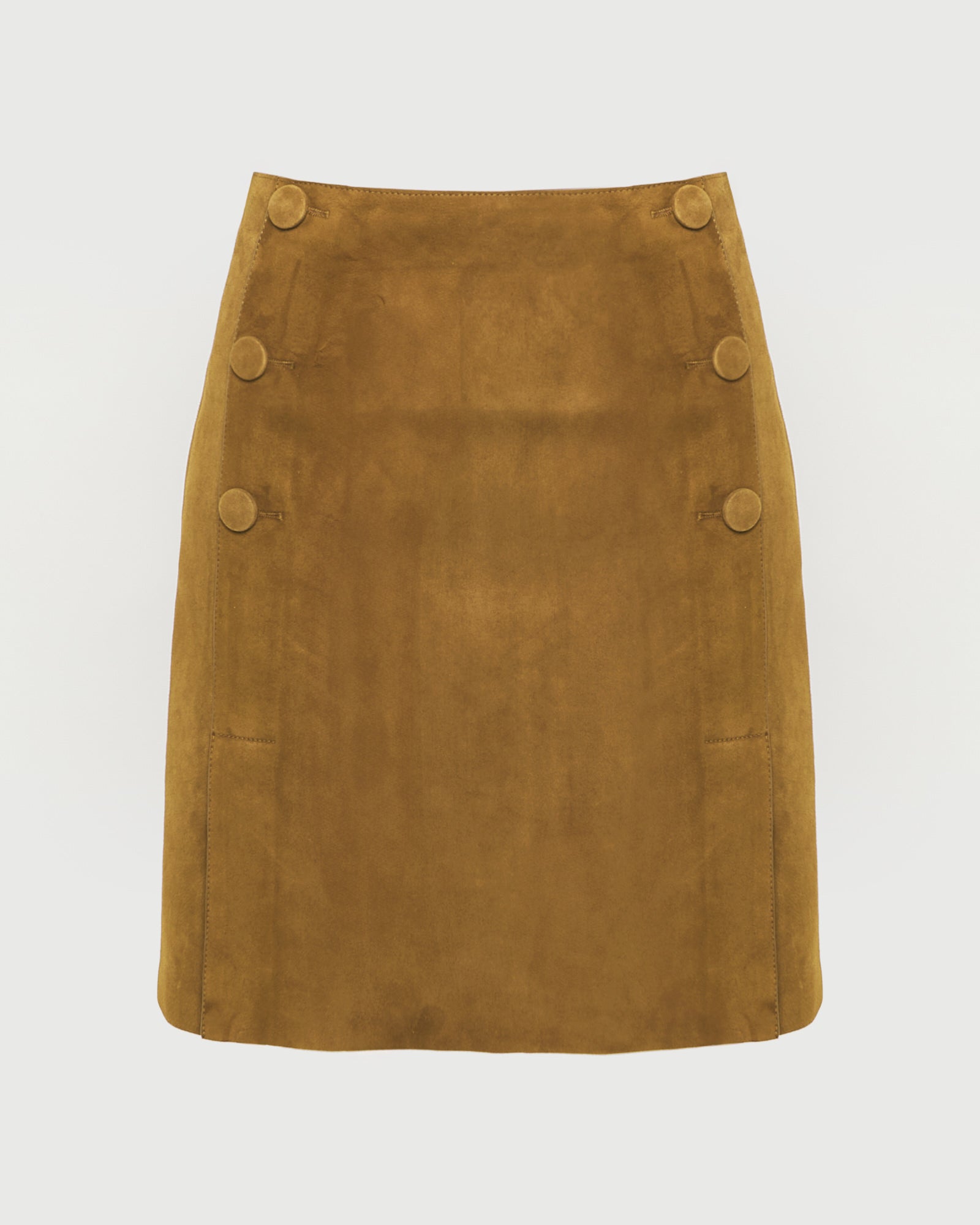 The velvety, nappa-effect finish of double-sided lambskin leather highlights the clean lines of this short skirt, with a slight A-line cut. A set of double buttons, covered with matching leather, and two slits provide a pared-down elegance for this fluid design.