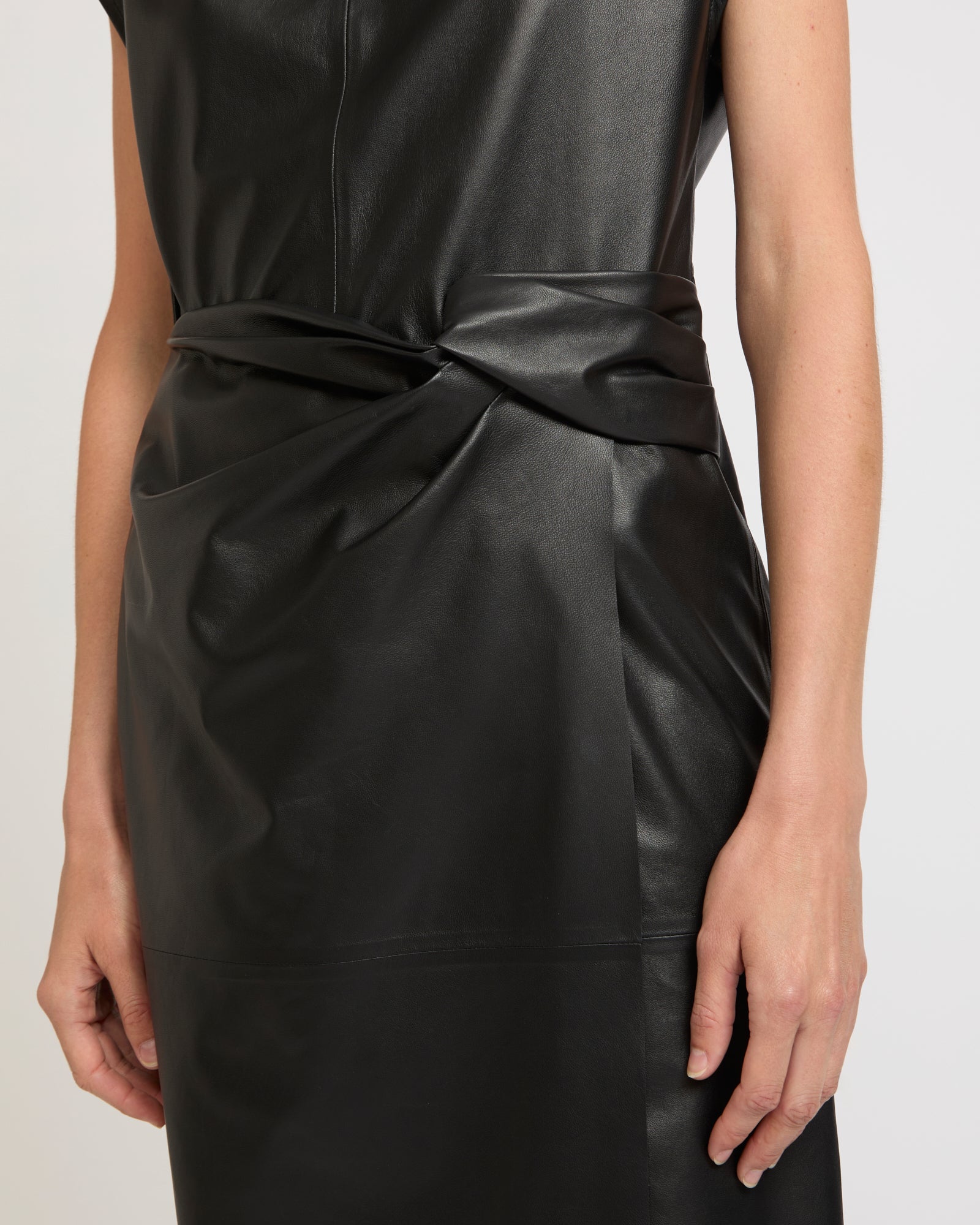 Cut from supple, weightless lambskin leather, this midi dress with a figure-hugging shape features a twisted, draped detail at the waist to highlight both the silhouette and the fluid quality of the material.