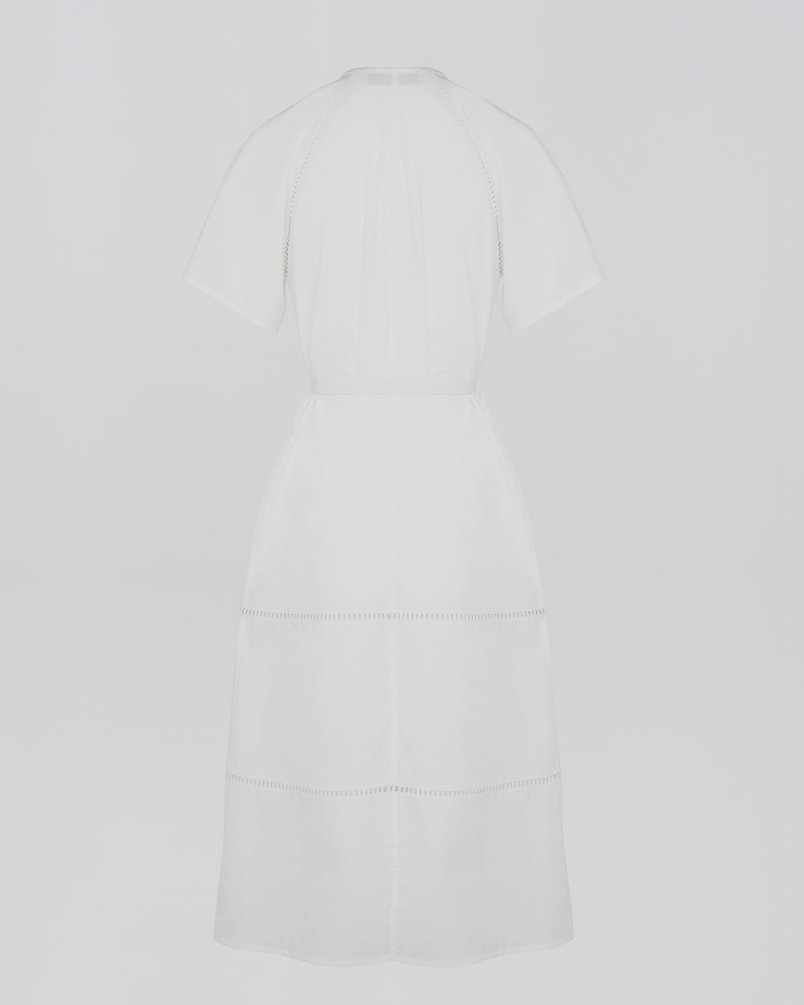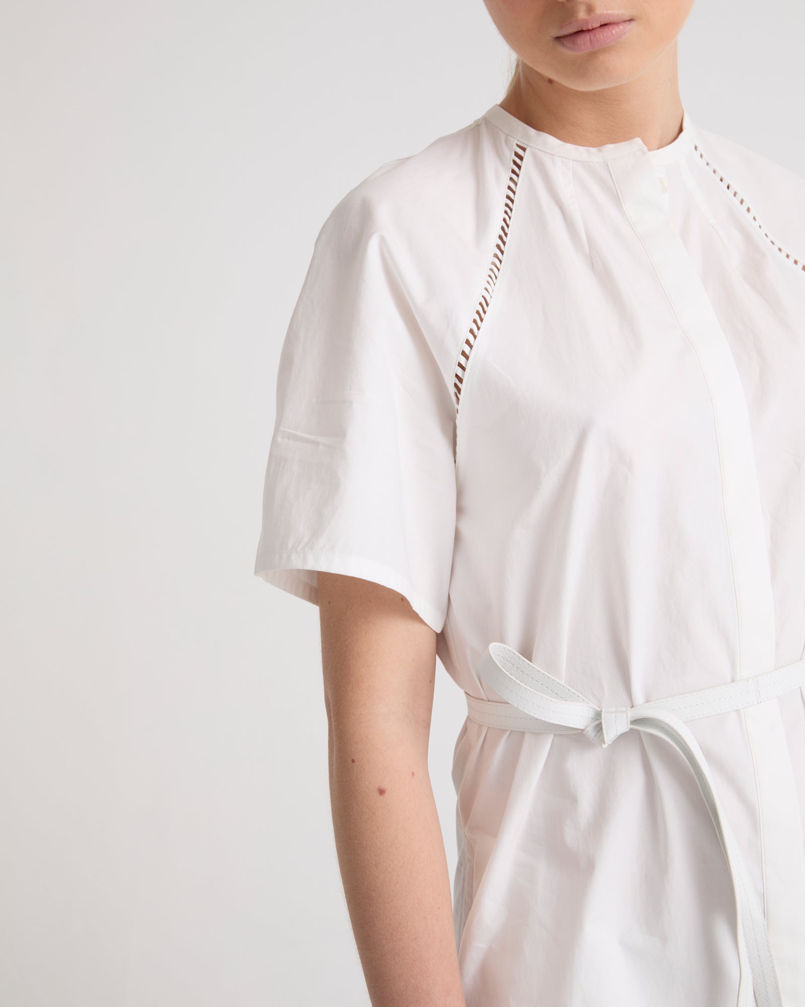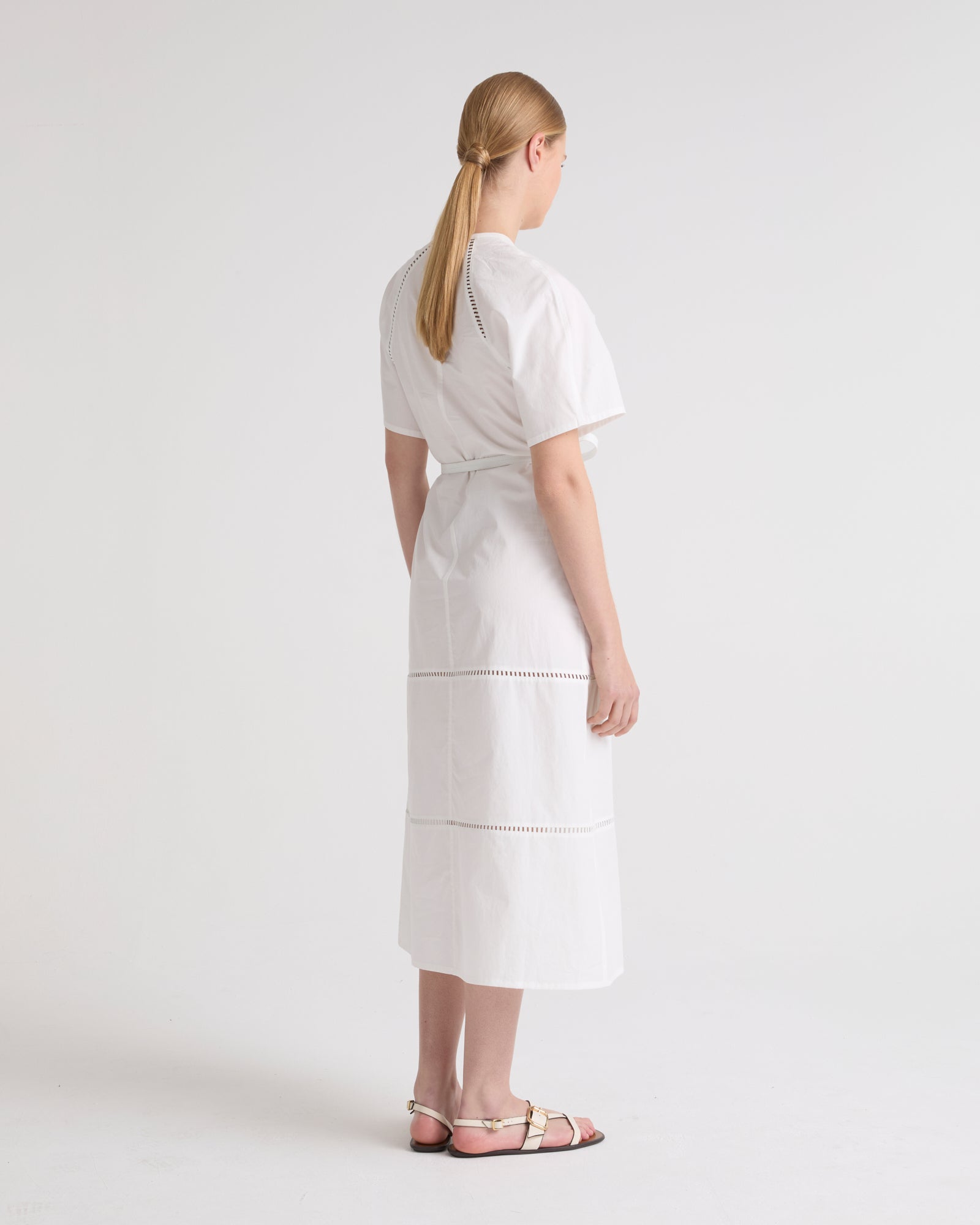 The crispness of cotton poplin for a midi-length, shirt-style dress with a figure-skimming cut. Leather broderie inserts bring a graphic feel to its round-necked silhouette. Can be worn belted.