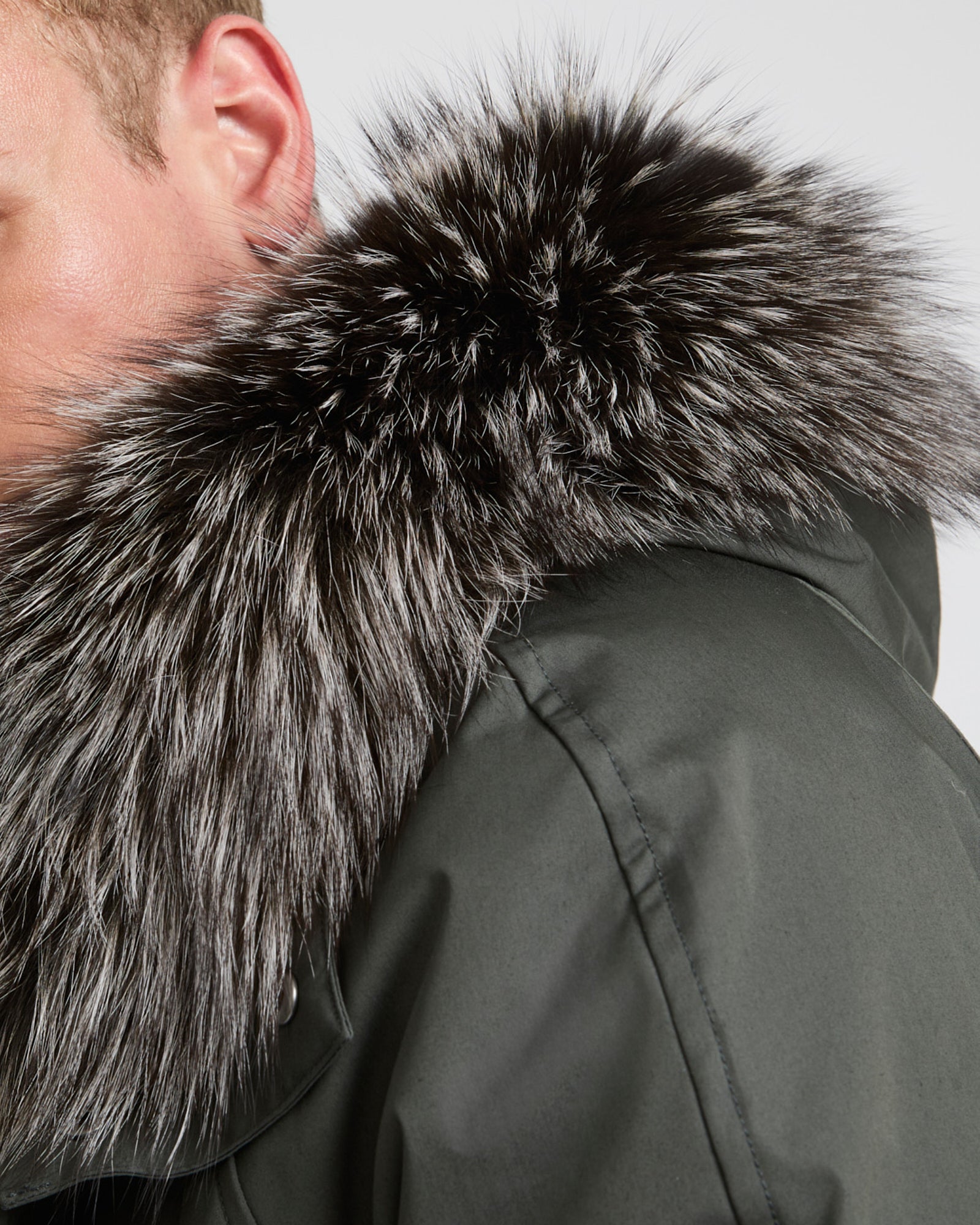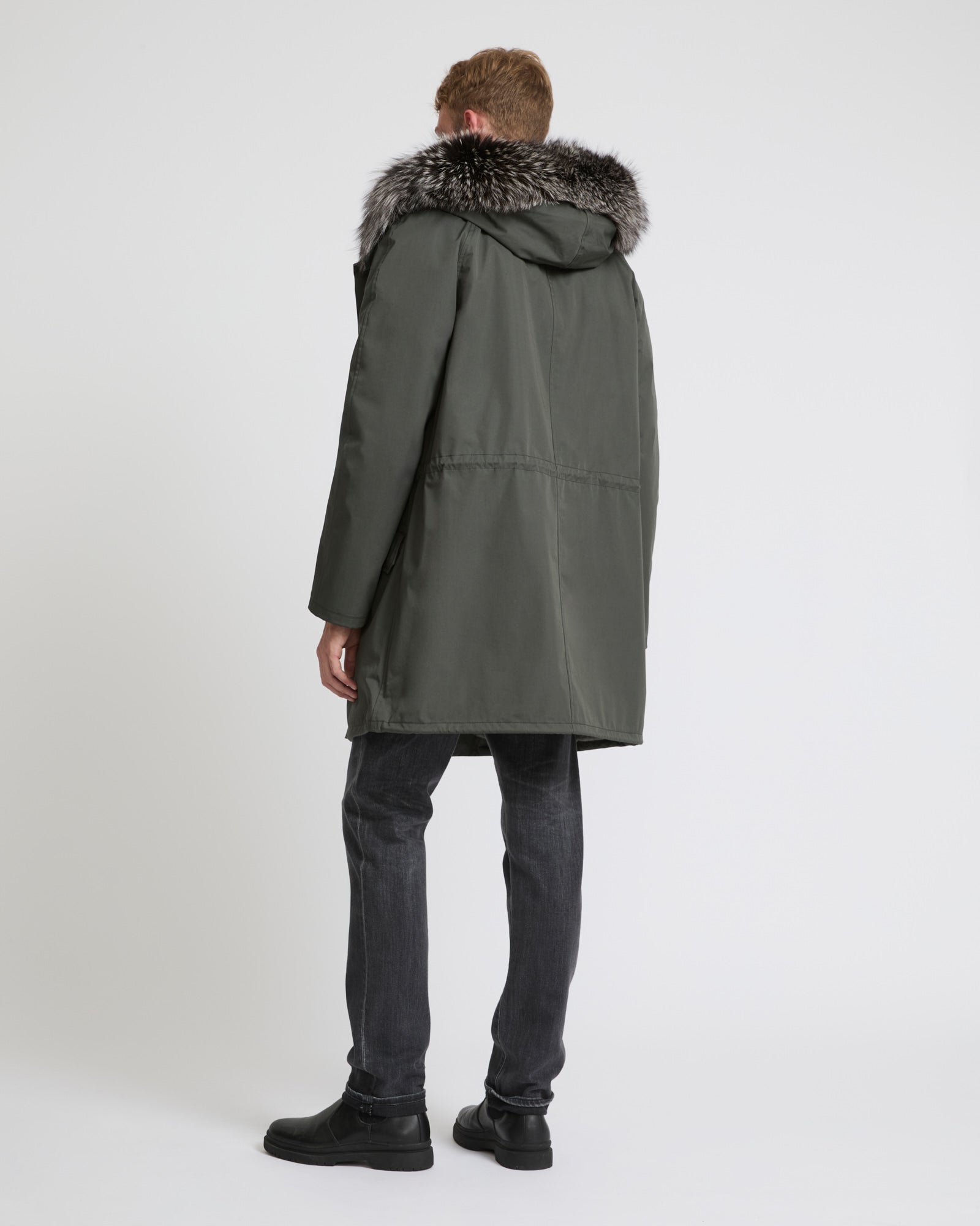 Winter's perfect parka. Its weatherproof technical fabric hides a removable rabbit-fur lining, while the fox trim of the hood is also detachable. A drawstring at the waist allows the fit to be adjusted according to requirements, and a zip plus button fastening provides double protection against cold air.