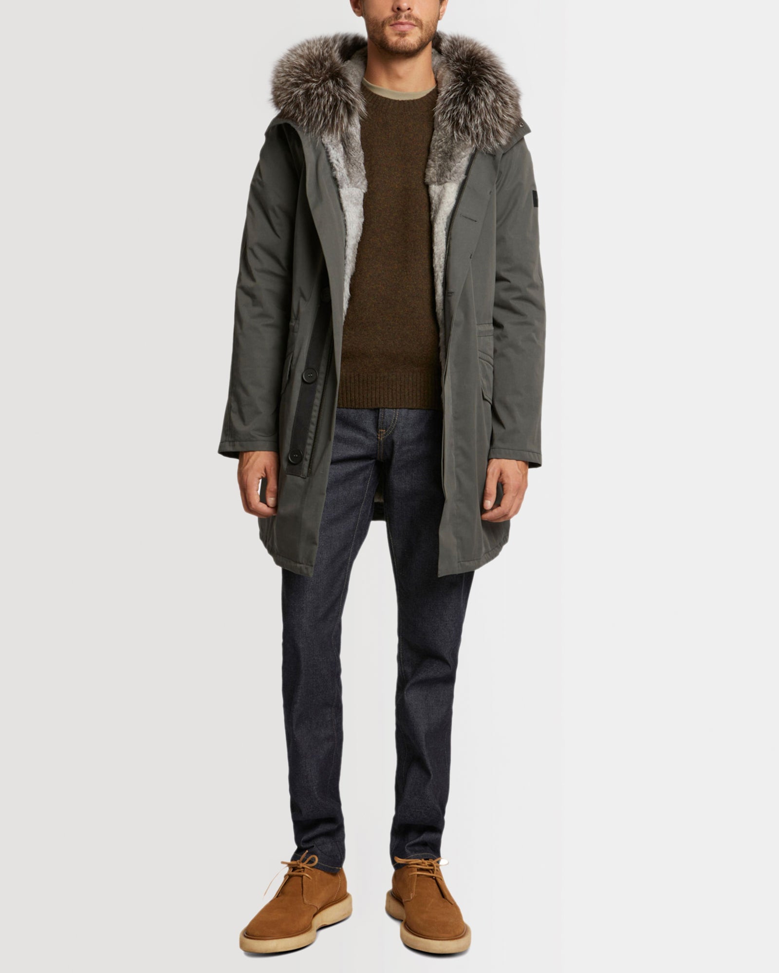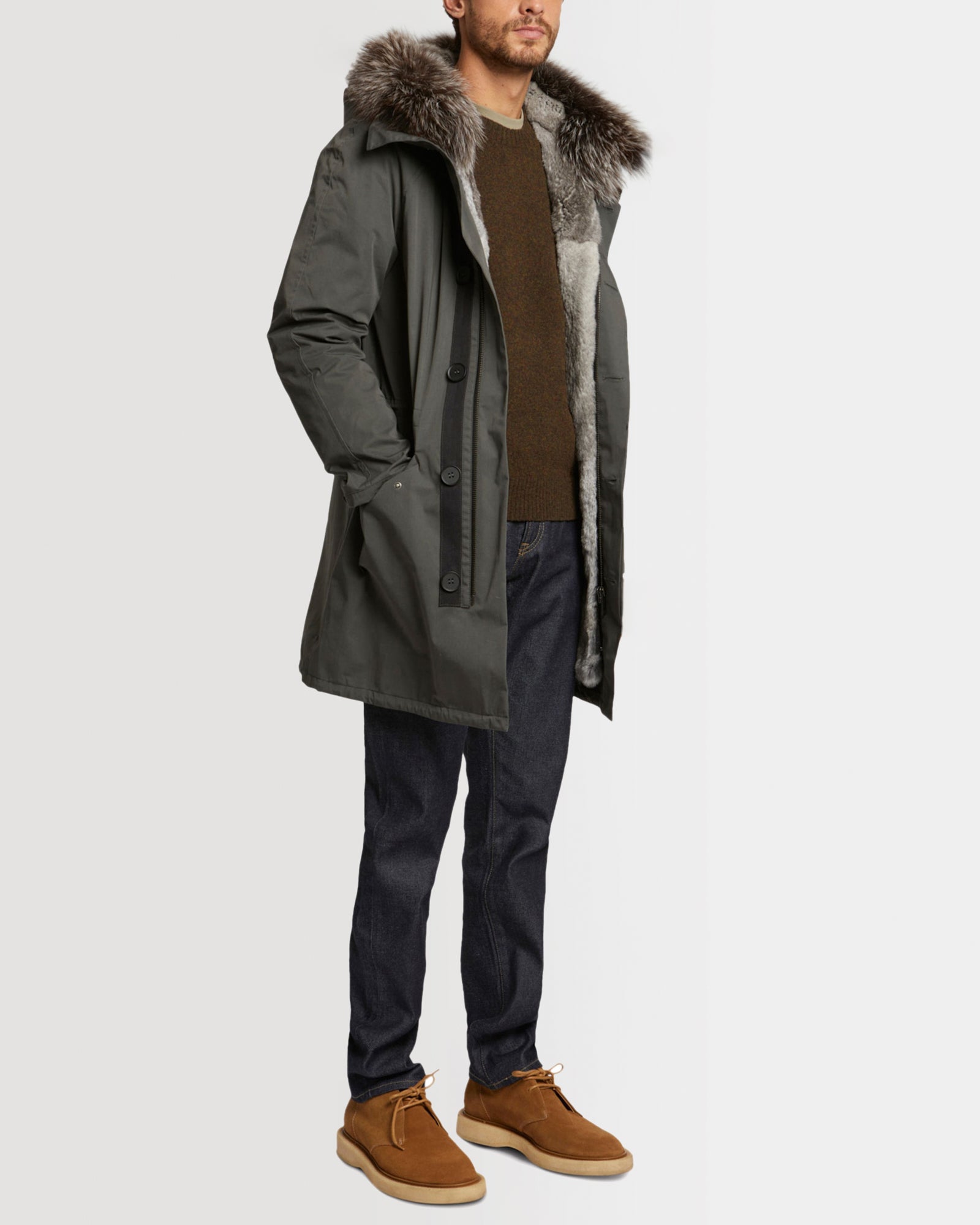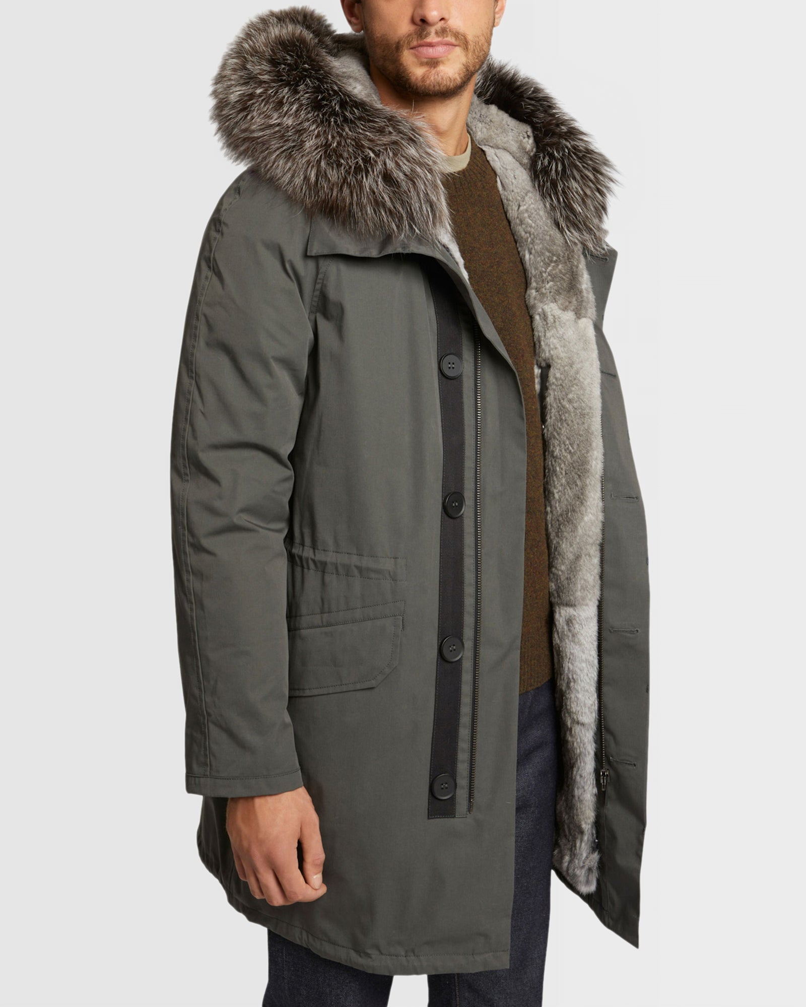Winter's perfect parka. Its weatherproof technical fabric hides a removable rabbit-fur lining, while the fox trim of the hood is also detachable. A drawstring at the waist allows the fit to be adjusted according to requirements, and a zip plus button fastening provides double protection against cold air.