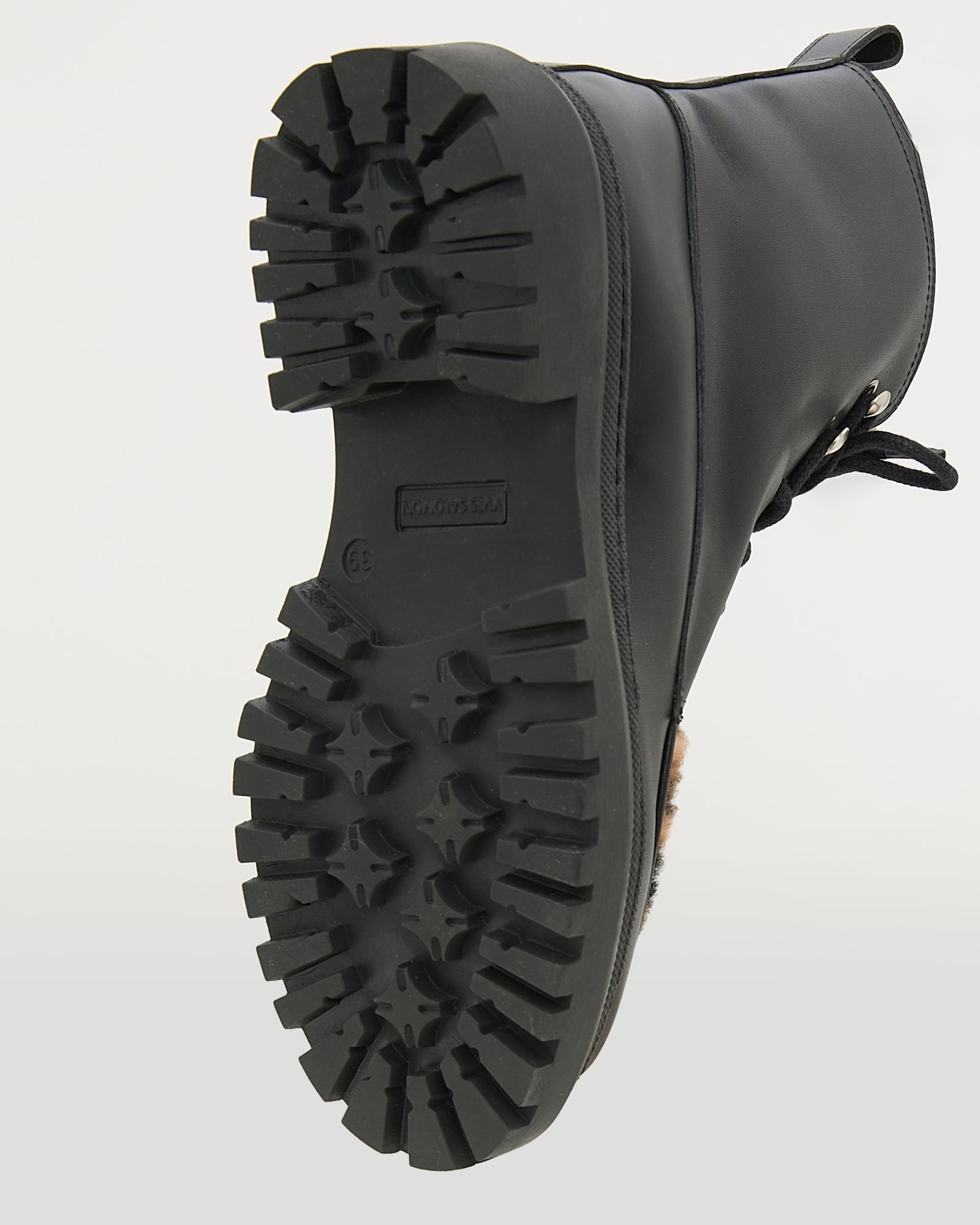 Style, comfort and warmth combined with these ankle-height lace-up boots, which play on the contrasting textures of leather and Lacon shearling. Thick rubber soles with treads allow for safe steps both in the city and in the mountains.