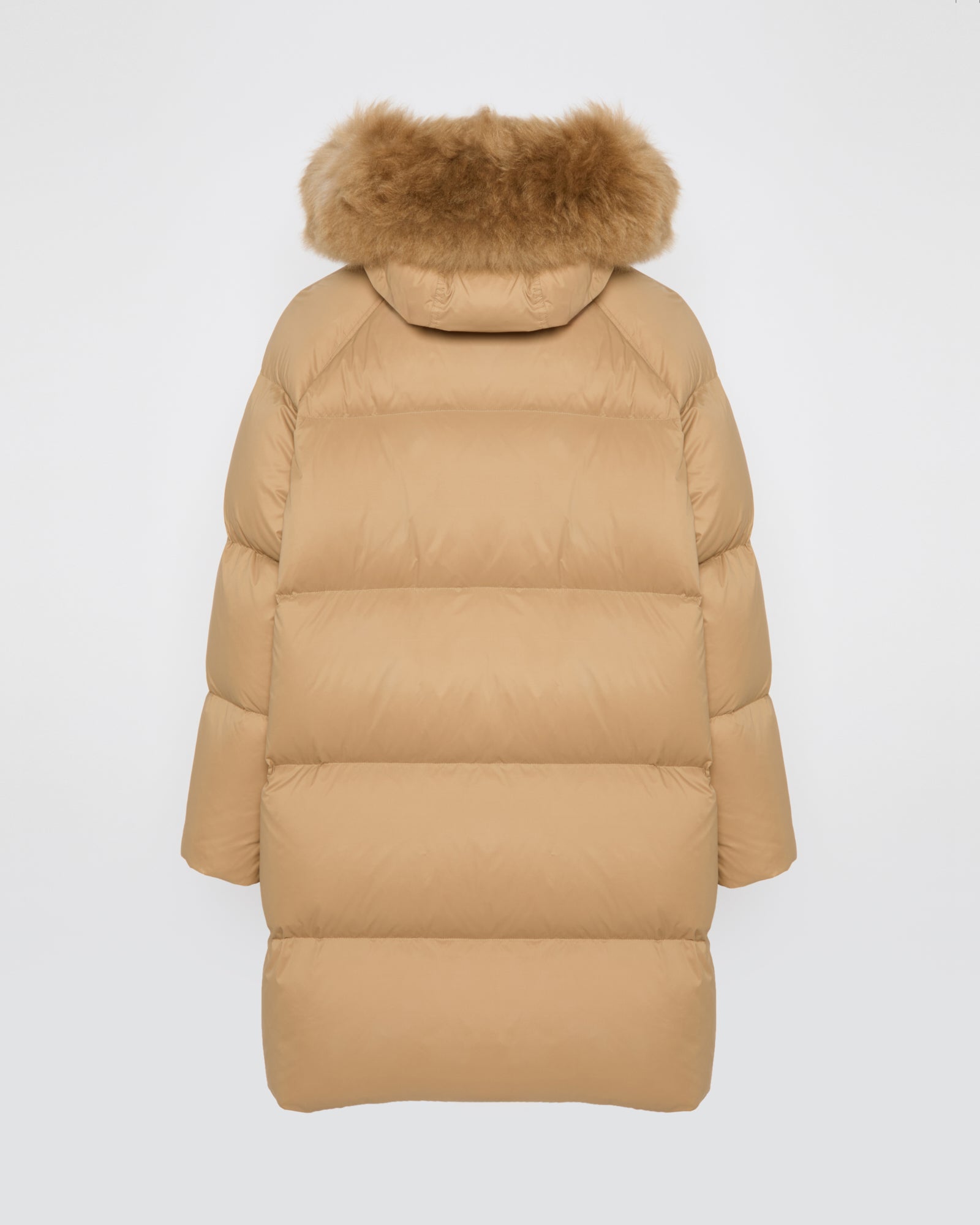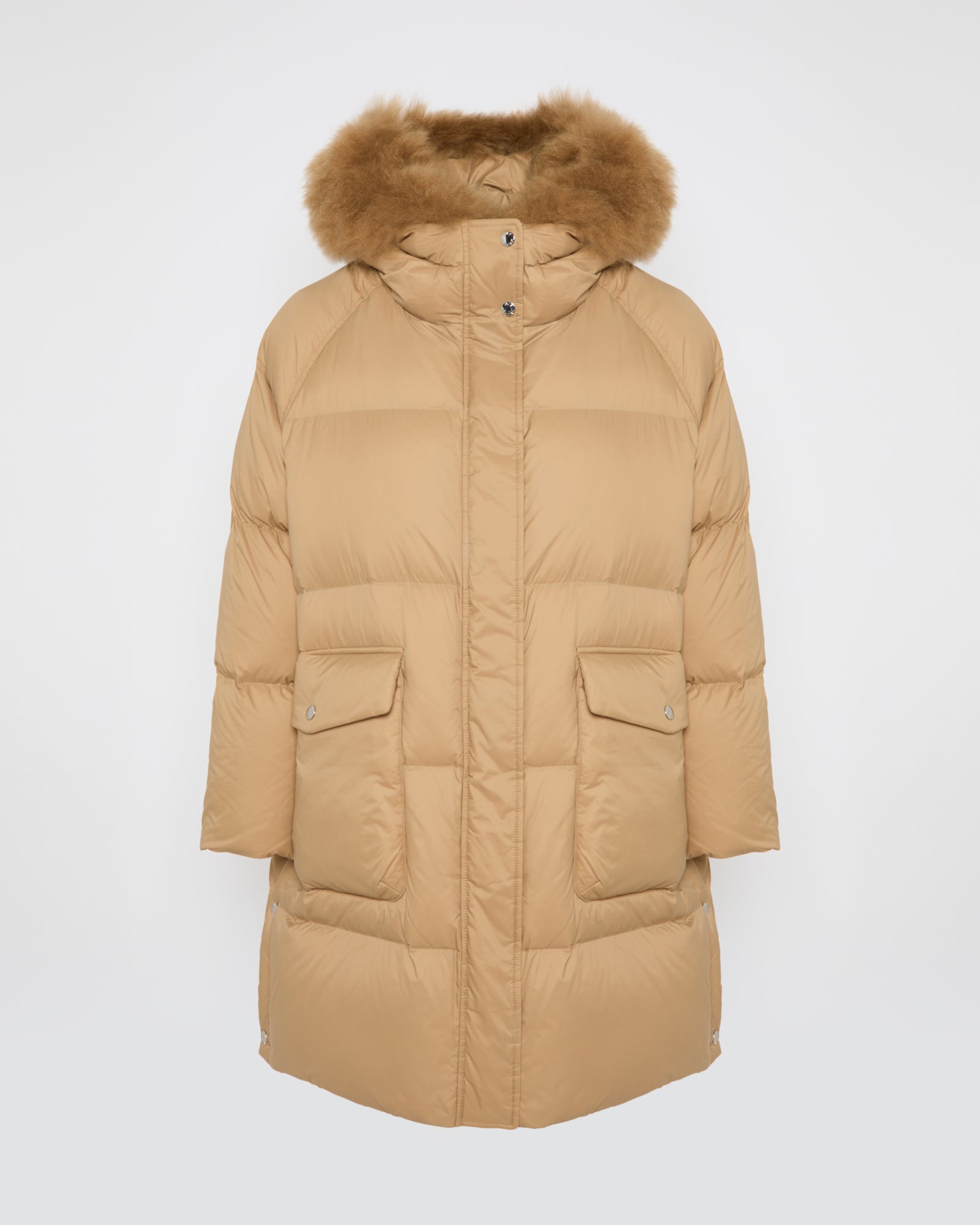 Long down jacket with raglan sleeves and fluffy lambswool trim