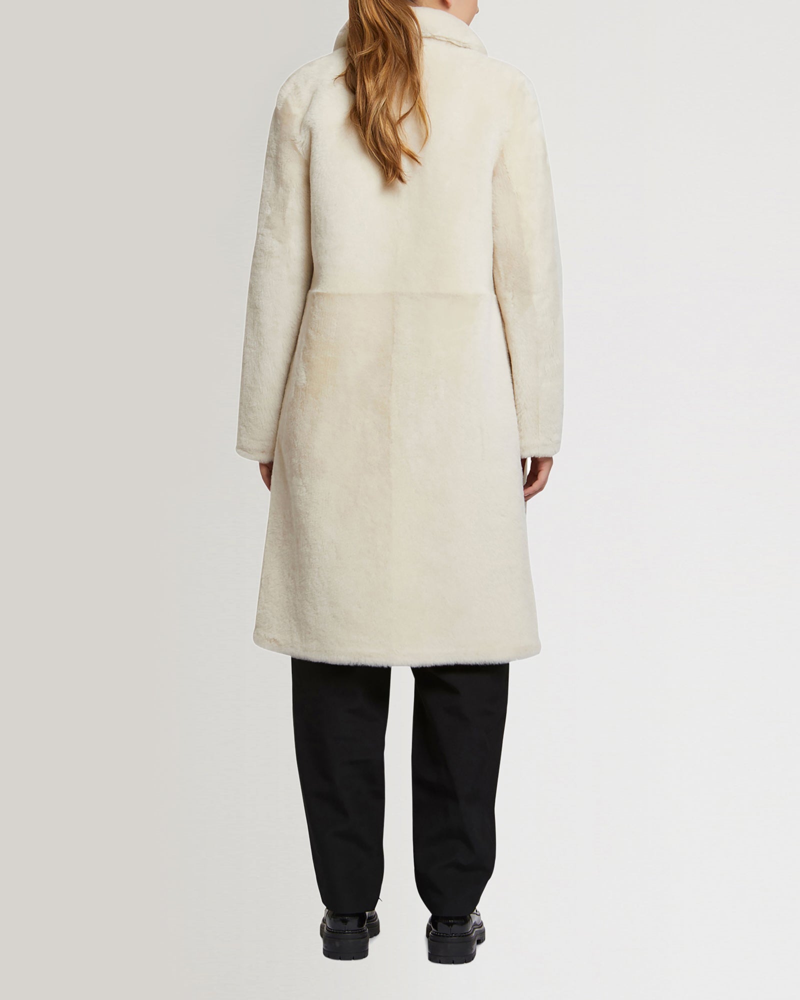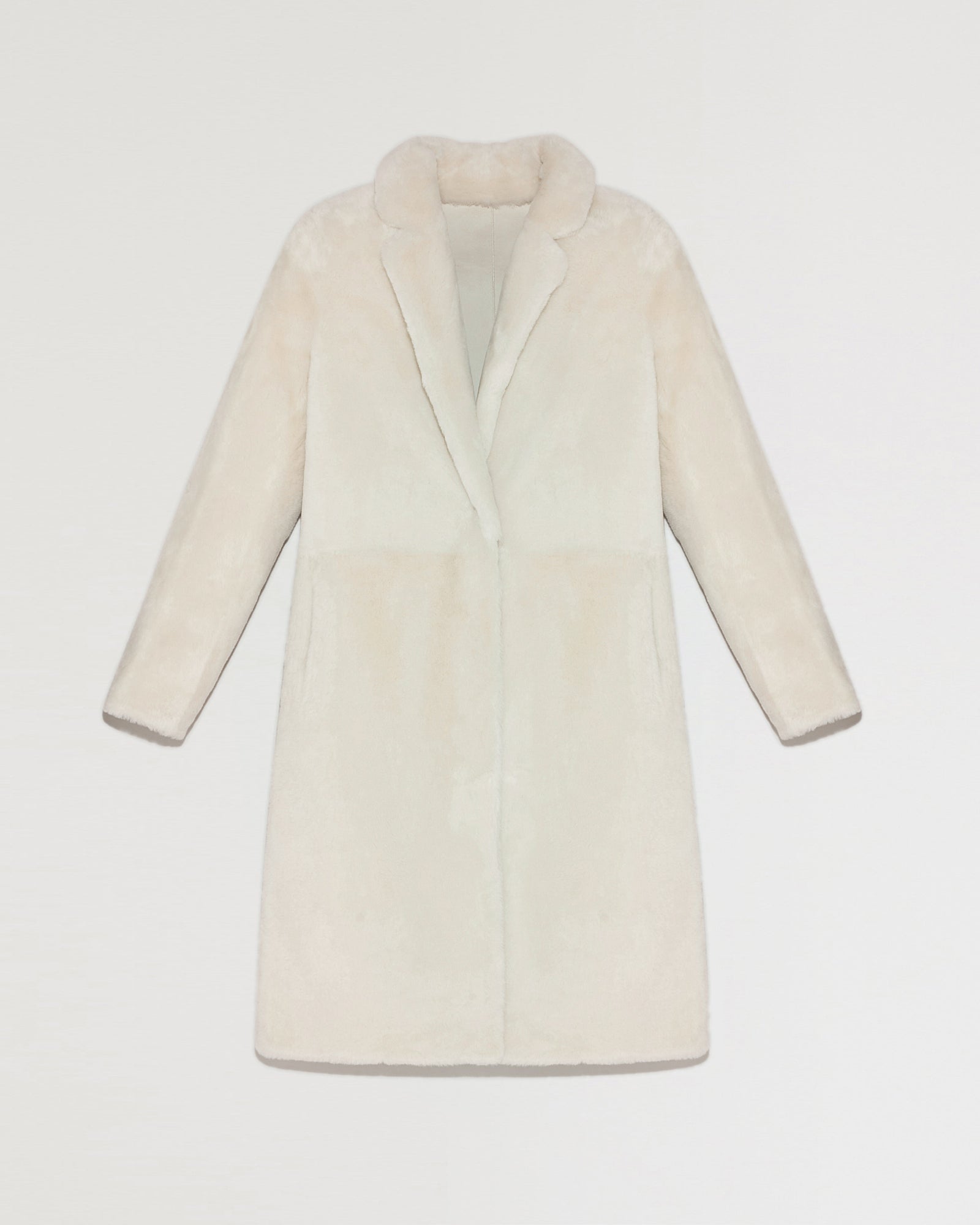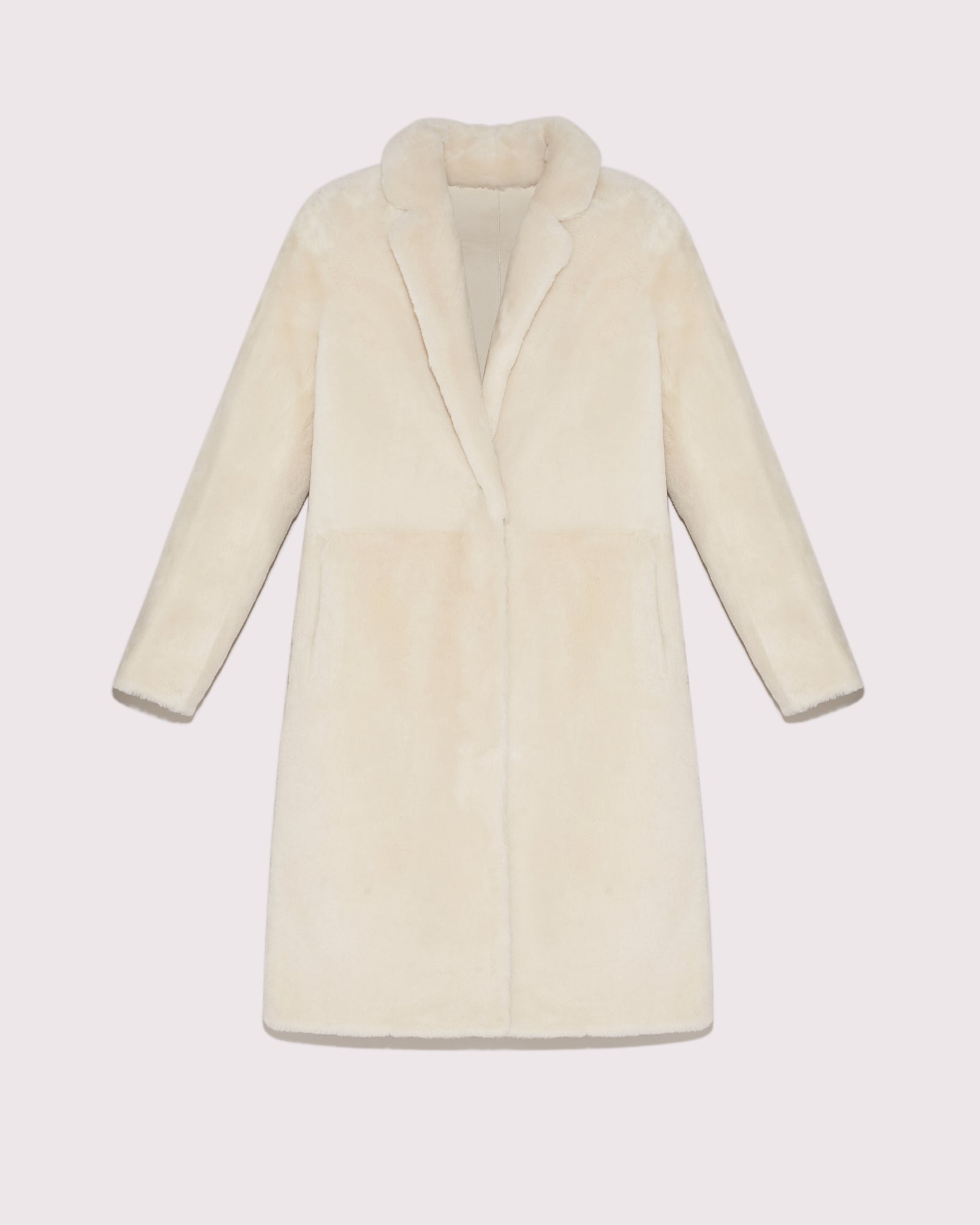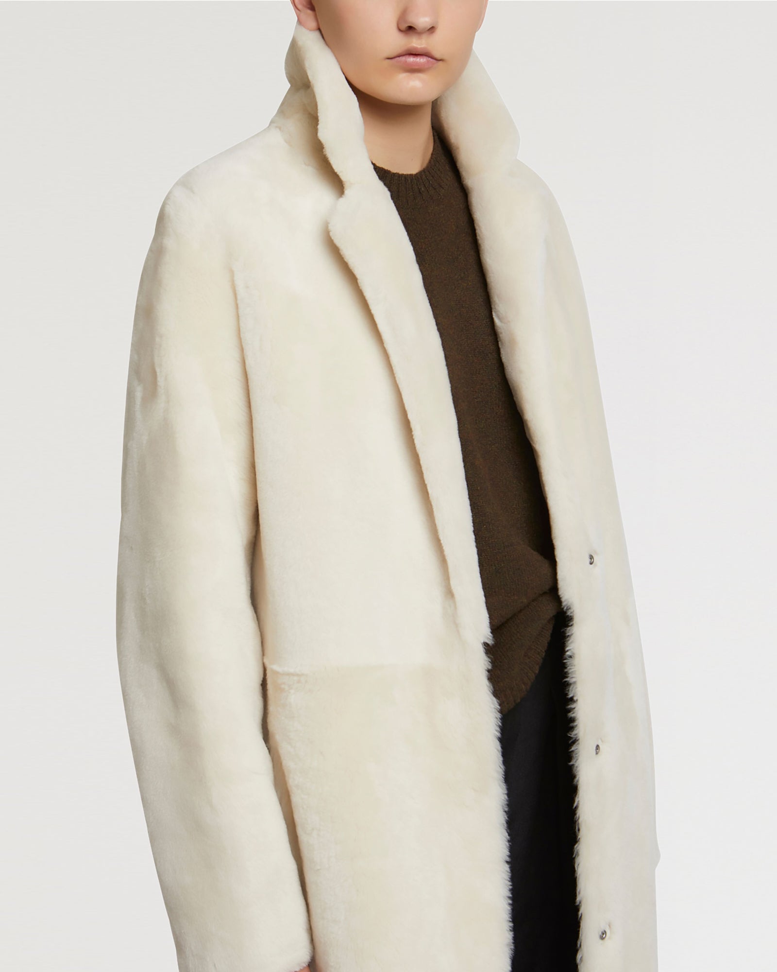Long reversible shearling coat featuring a masculine feminine look crafted from merino with one side in smooth leather. Warm and enveloping, it remains supple and easy to wear. Design details include a tailored collar, a straight cut, two slit pockets and a front press-stud fastening for a pared back silhouette. An elegant yet functional coat to embrace winter with ease and style.