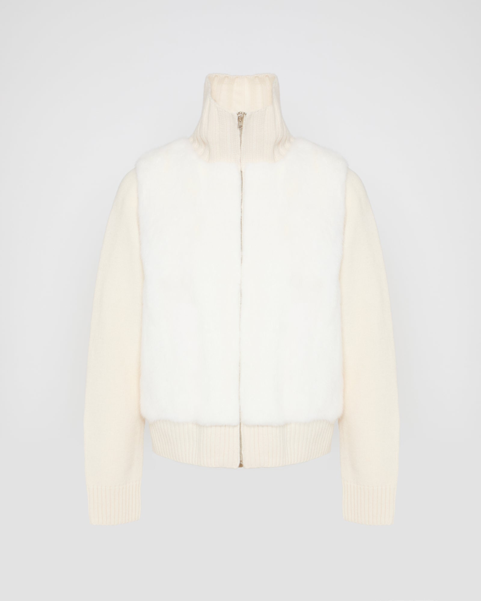 The clever, impeccably assembled combination of luxurious, long-haired mink fur and Merino knit. The front and back are in fur, with the sleeves and hem worked in knit, in a perfectly-crafted piece which highlights the Yves Salomon expertise.