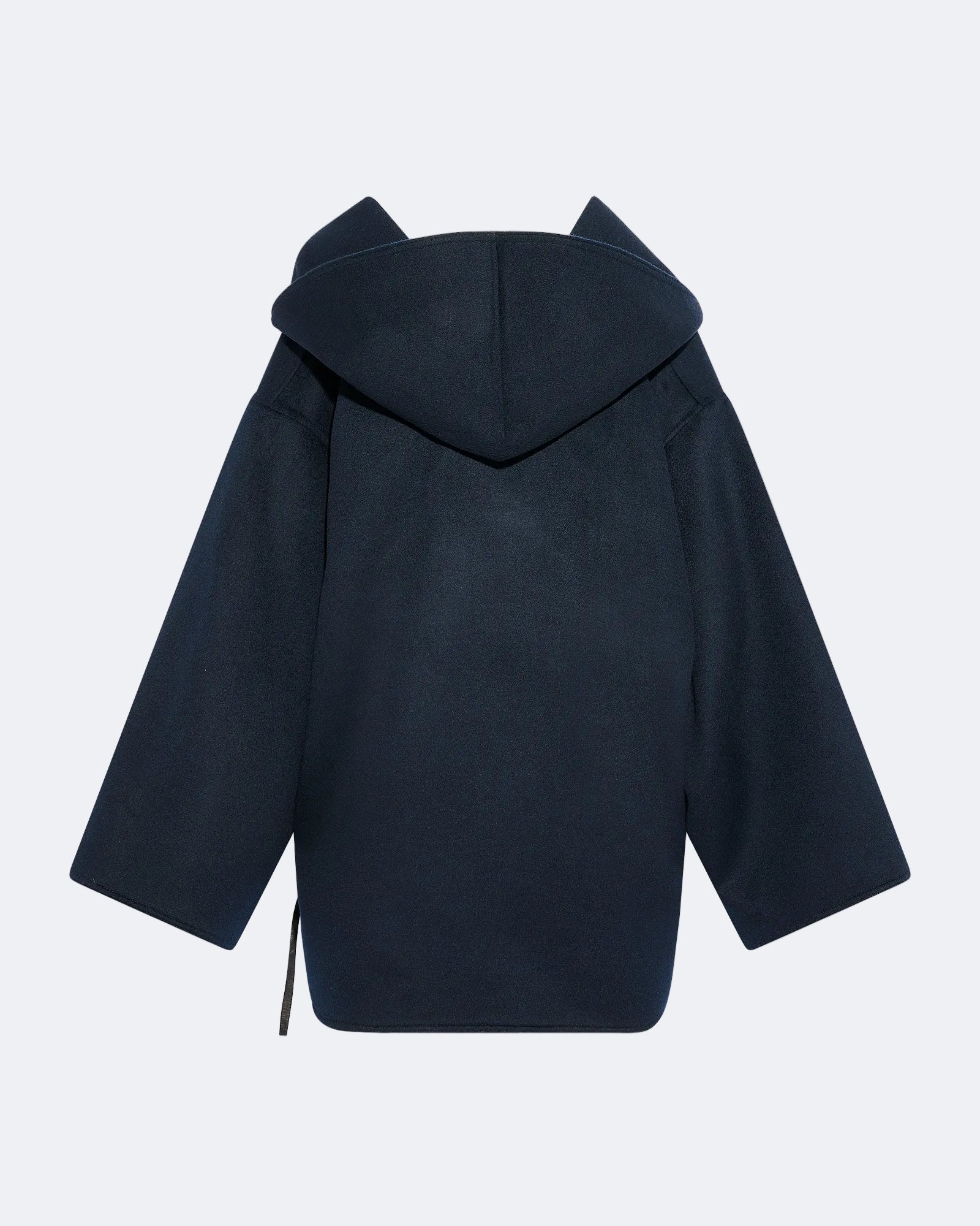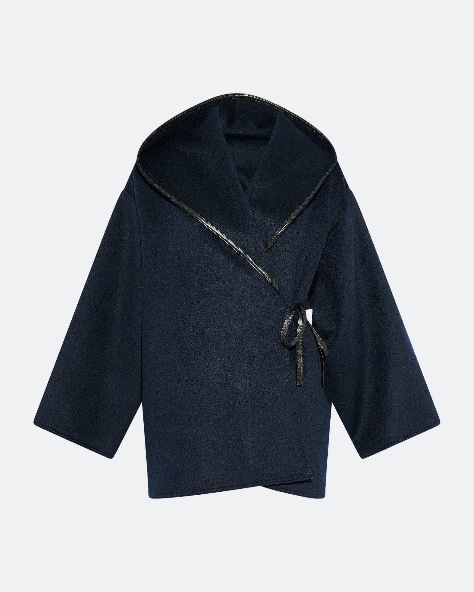 The soft hand of a cashmere blend highlights the cut of this short coat with oversized lines, featuring a generous hood and asymmetrical front fastening. Leather details – trim, tie – provide a visual contrast and an additional luxurious touch.