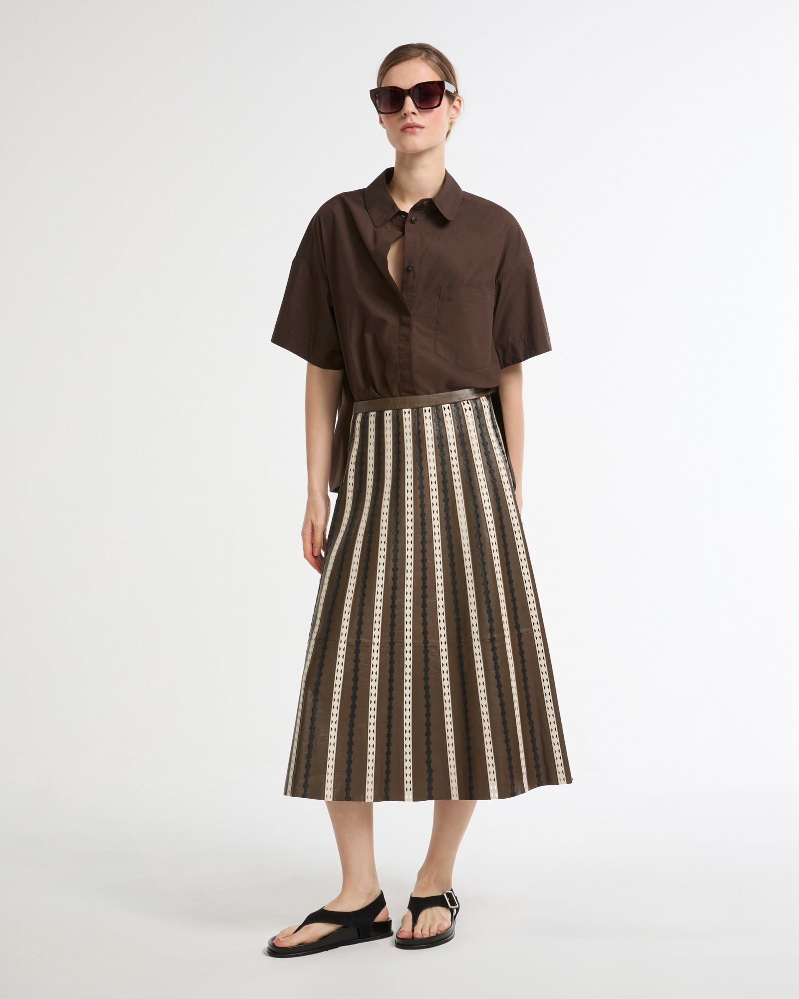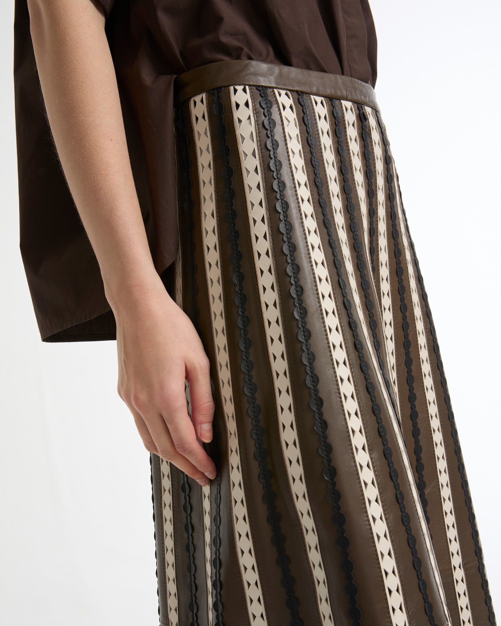 A flared shape, midi length and detailed leather craftsmanship are the ket features of this wide skirt. A series of laser-cut strips of lambskin give a feeling of lightness to this design which highlights the Yves Salomon savoir-faire.