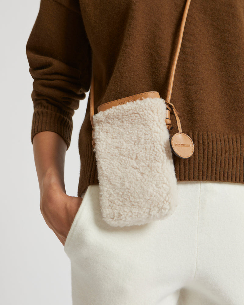 Crafted from merino lamb, the mix between the curly wool and the leather adds visual interest and a retro touch to this phone case. Functional yet feminine, it features an adjustable leather strap to wear it higher or lower and match any style.