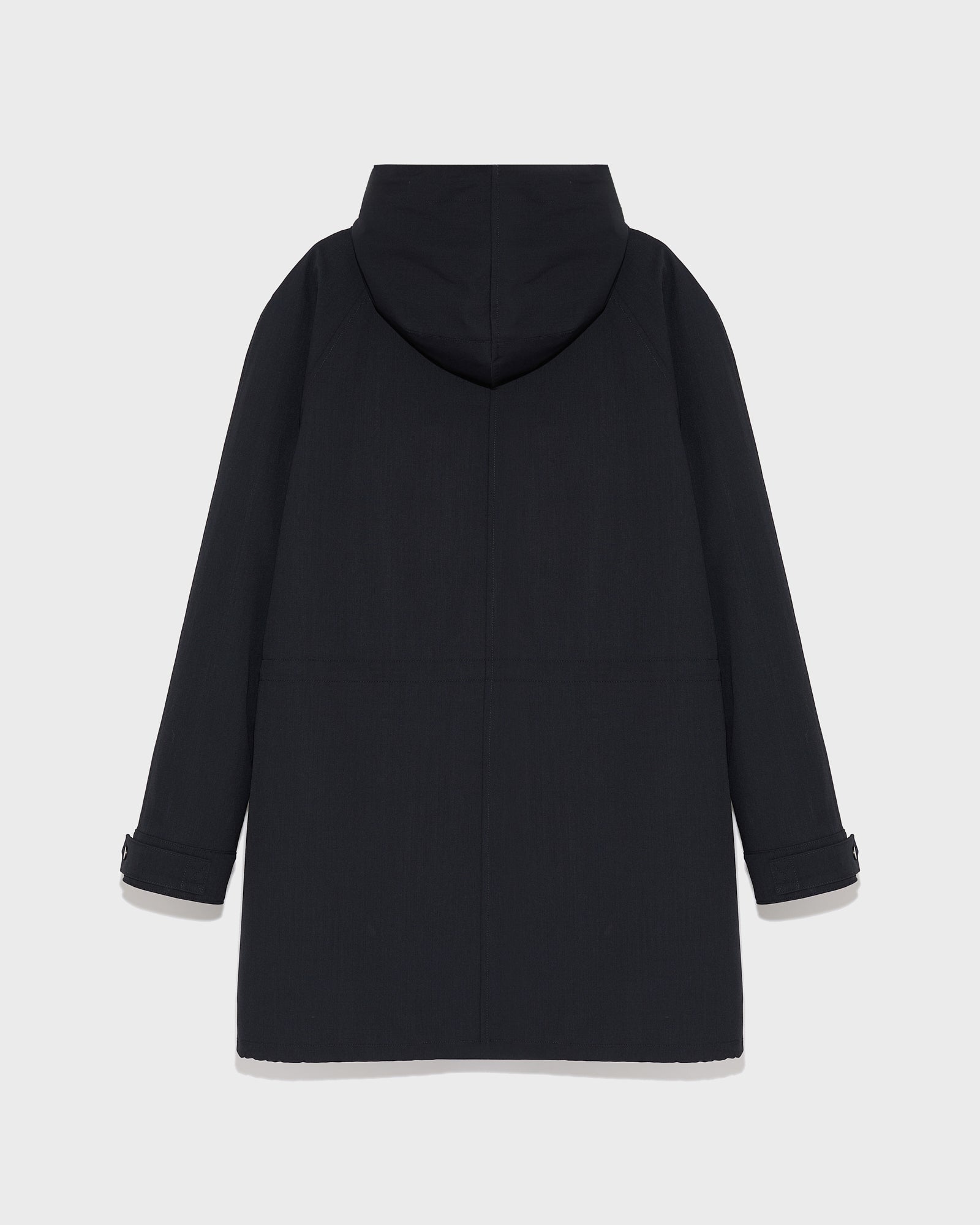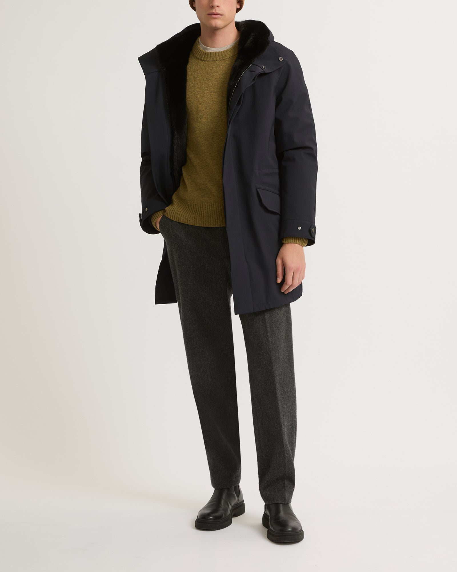 Versatility, warmth and elegance for a long parka with classic lines, worked in a technical wool fabric with weather and time-resistant properties. A first inner lining in highest quality down can be removed if required, as can a second hood and facing lining in long-haired mink, adding an extra luxurious touch.