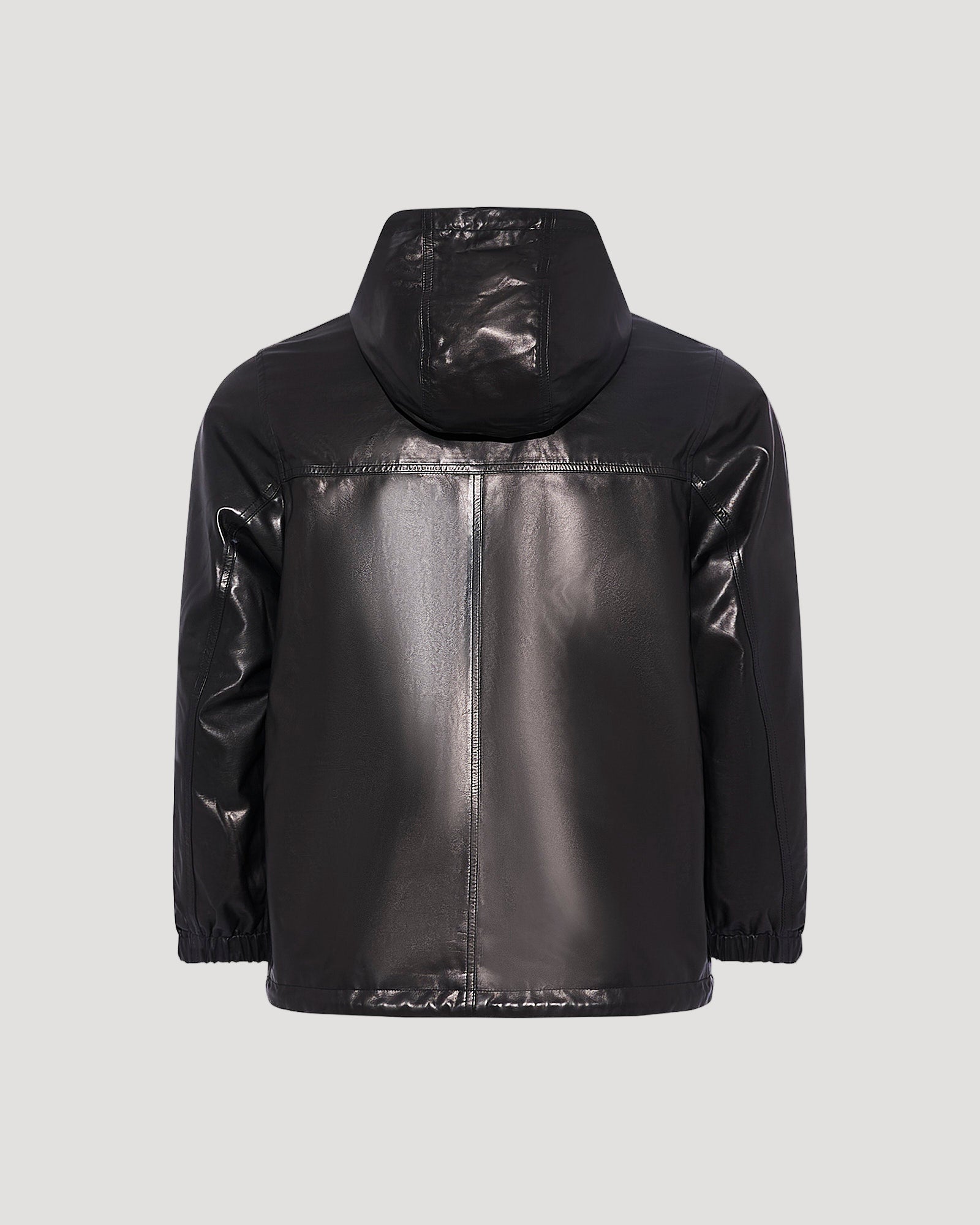 The classic hoodie shape revisited in a soft and supple baby calf, with a reversible technical fabric face. Front zip fastening.