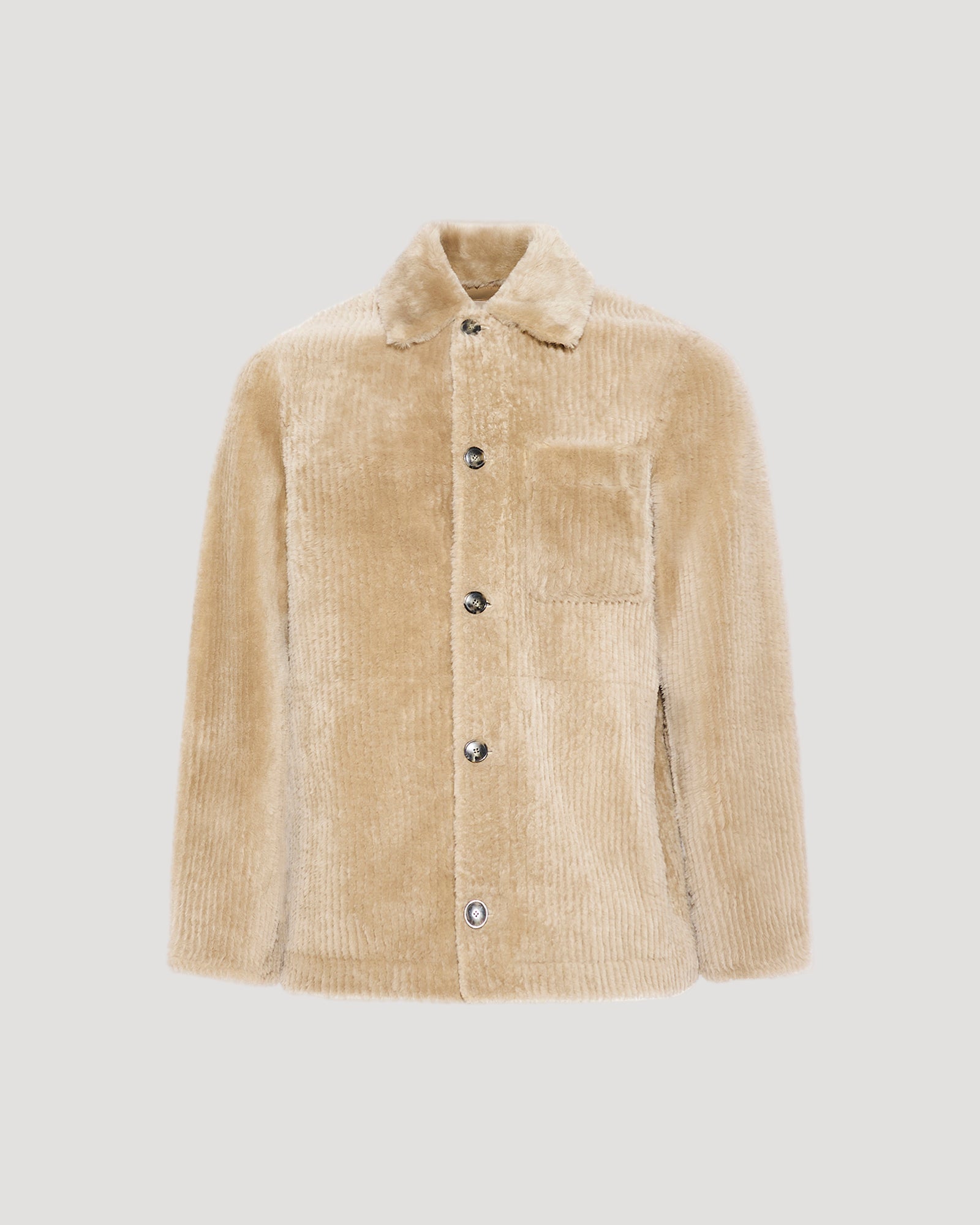 A slightly oversized overshirt shape for this jacket in Merino shearling, worked with a textured, ribbed effect on the outer nappa layer.