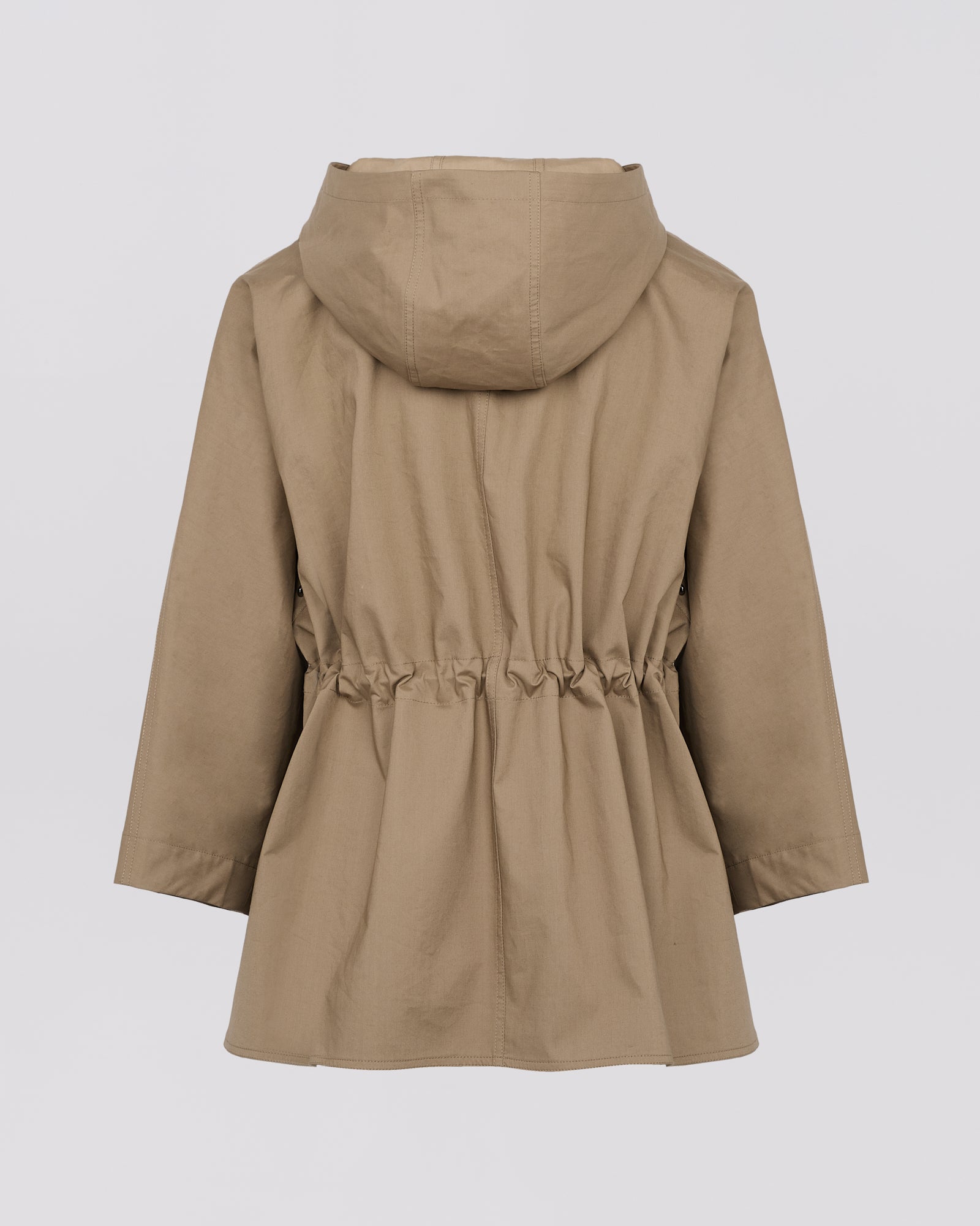 Crafted from double-sided cotton, this short hooded cape gives a feel that is both retro and contemporary with its front bib cutout. The zip fastening is covered by a large button placket with leather press-studs for a modern touch. A drawstring at the waist allows the fit to be adjusted and creates a more flared silhouette.