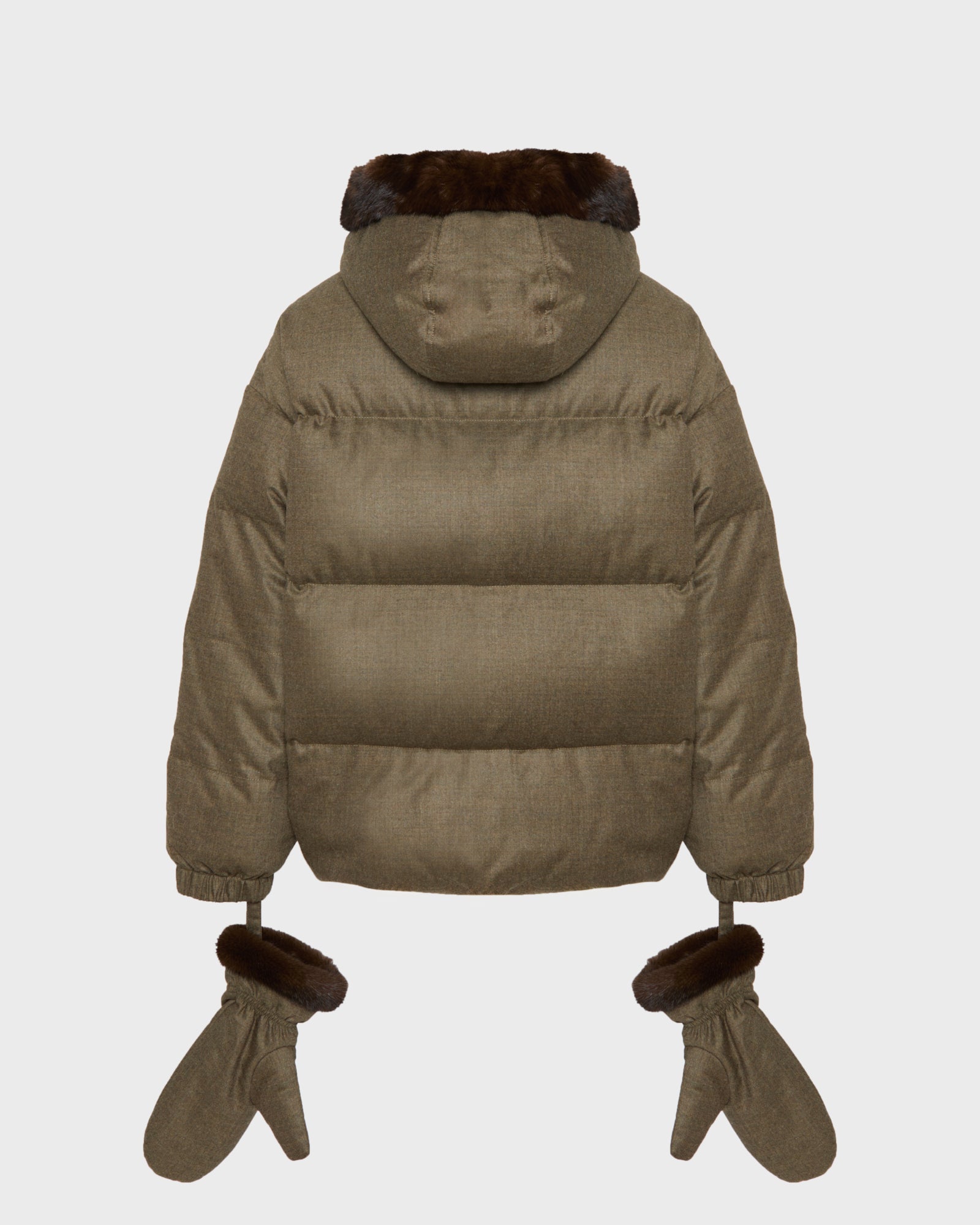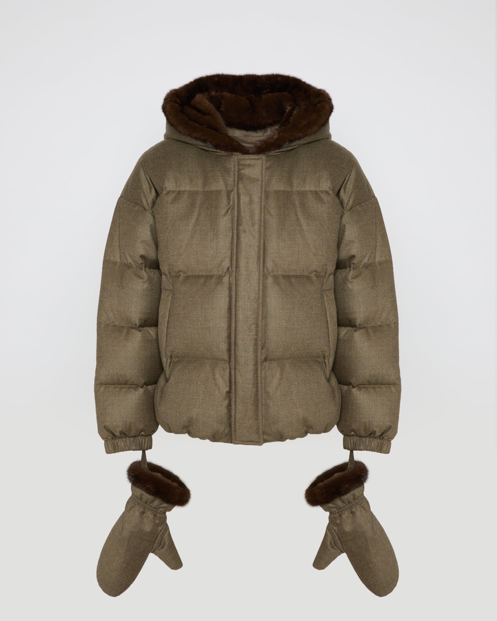 Worked in Loro Piana flannel fabric with an inner hood and hood trim in soft yet resistant mink fur, this short down jacket combines elegance and technical performance. Its Loro Piana wool-silk fabric, which uses the Storm System technique to ensure absolute protection against the elements. The mink elements are detachable, as are the matching mittens with mink trim, which can be clipped to the jacket for ease of use.