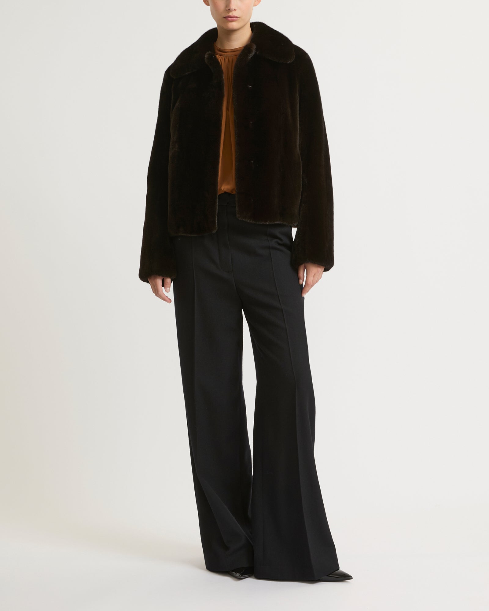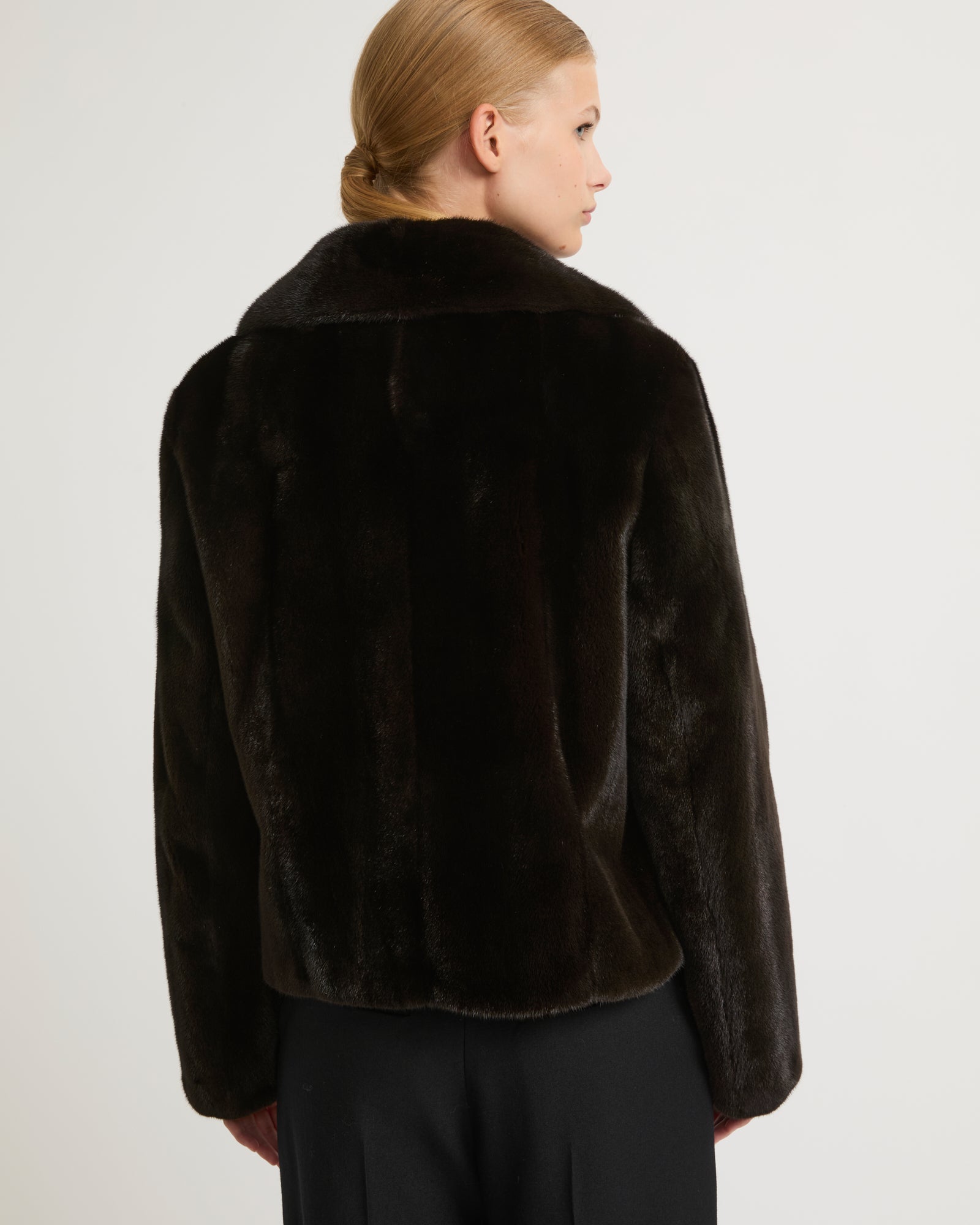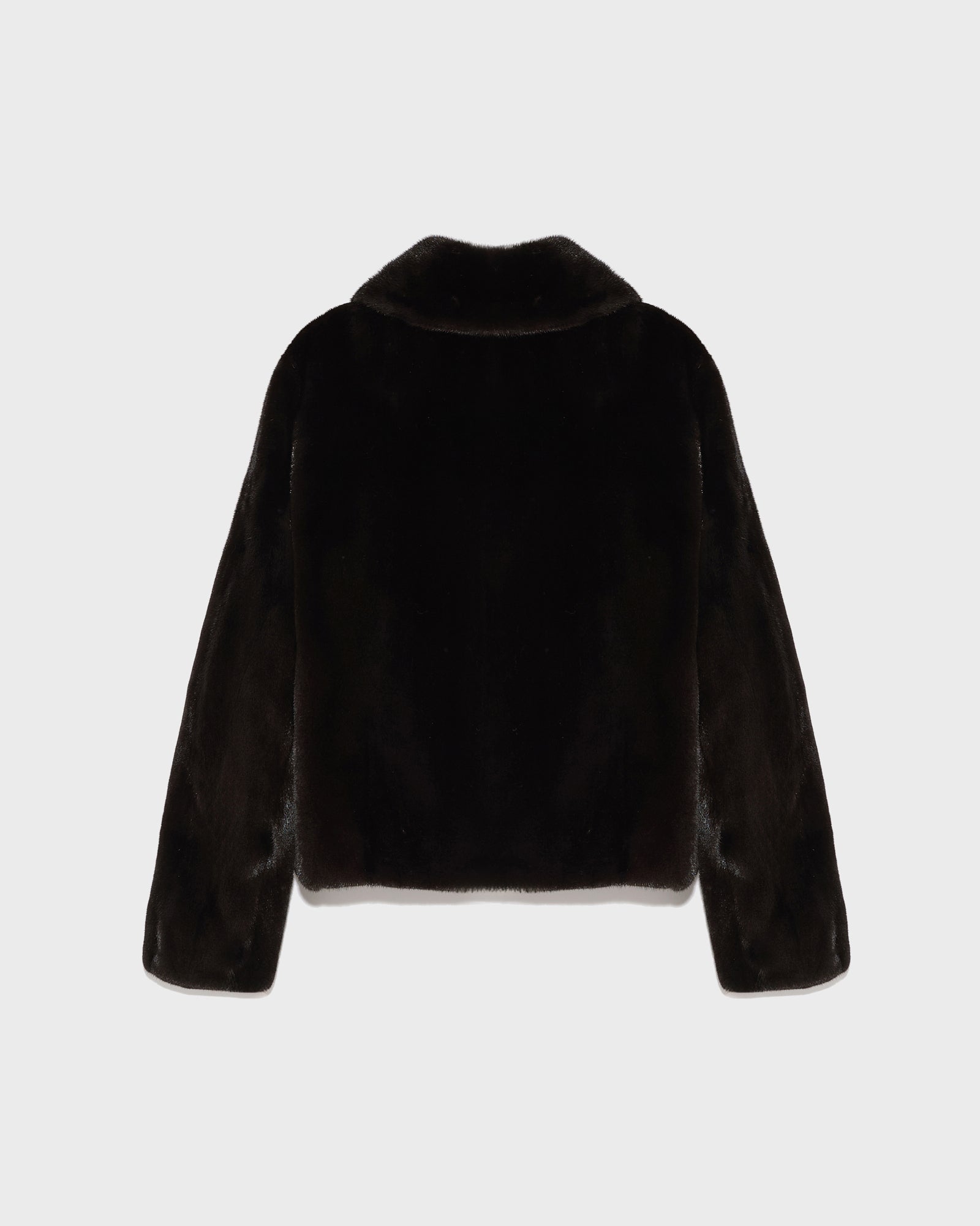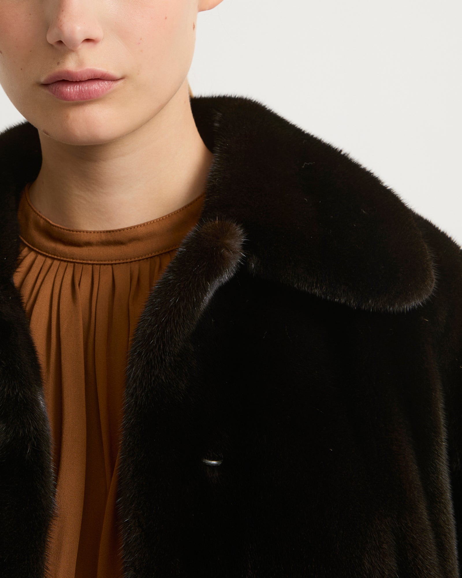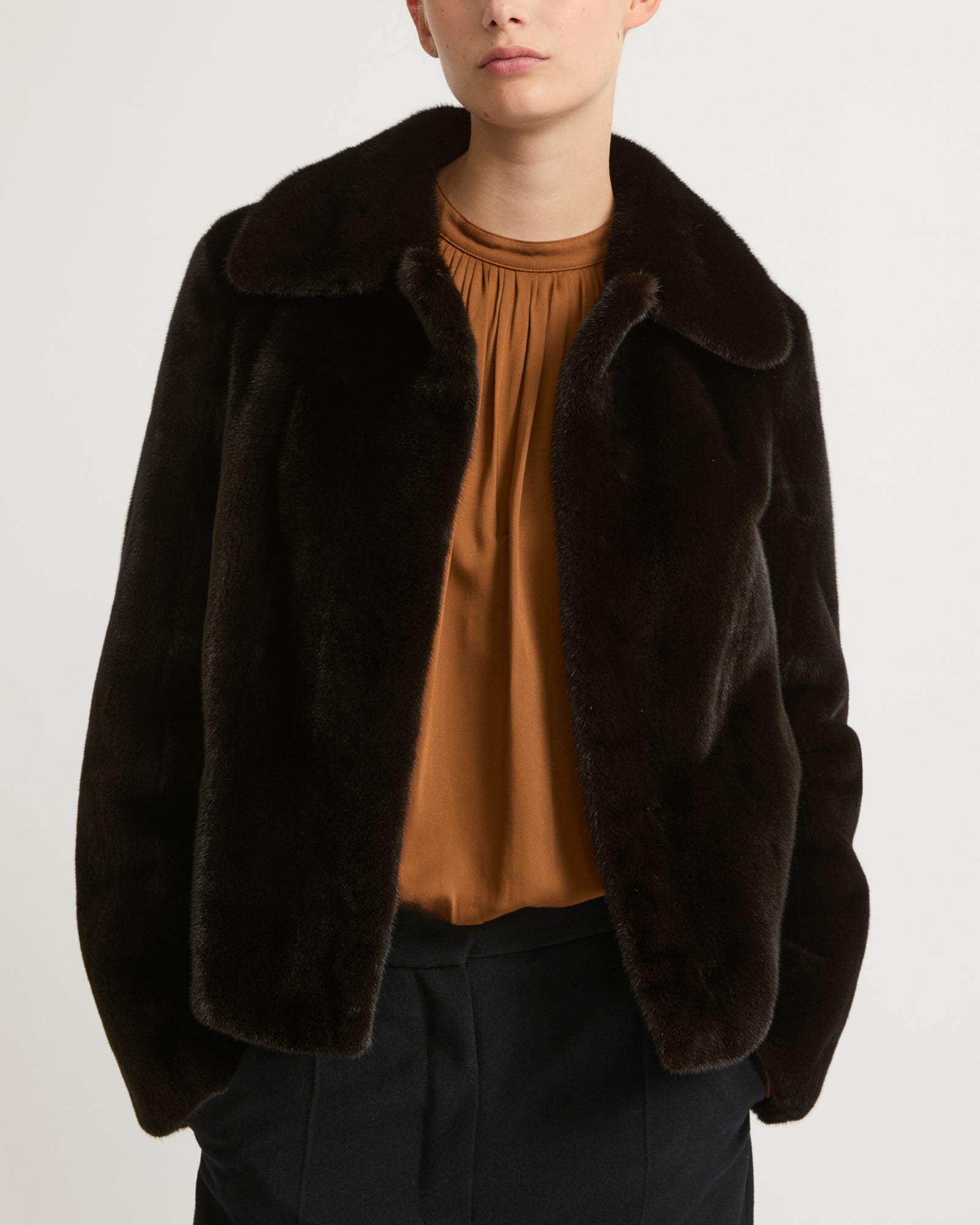 A short jacket made of long-haired Blackglama mink fur, distinguished by its durability, sheen, and understated natural elegance. Blackglama is renowned for its exceptionally dense, naturally black, glossy, and silky fur with a truly luxurious finish. It is an exceptionally rare type of mink, whose coat is naturally deep black. Featuring a pointed collar, slit pockets, and hook fastening, the cut is minimalist and the style details are subtle. Warm and enveloping, this piece is ideal for winter and embodies a timeless sense of style.