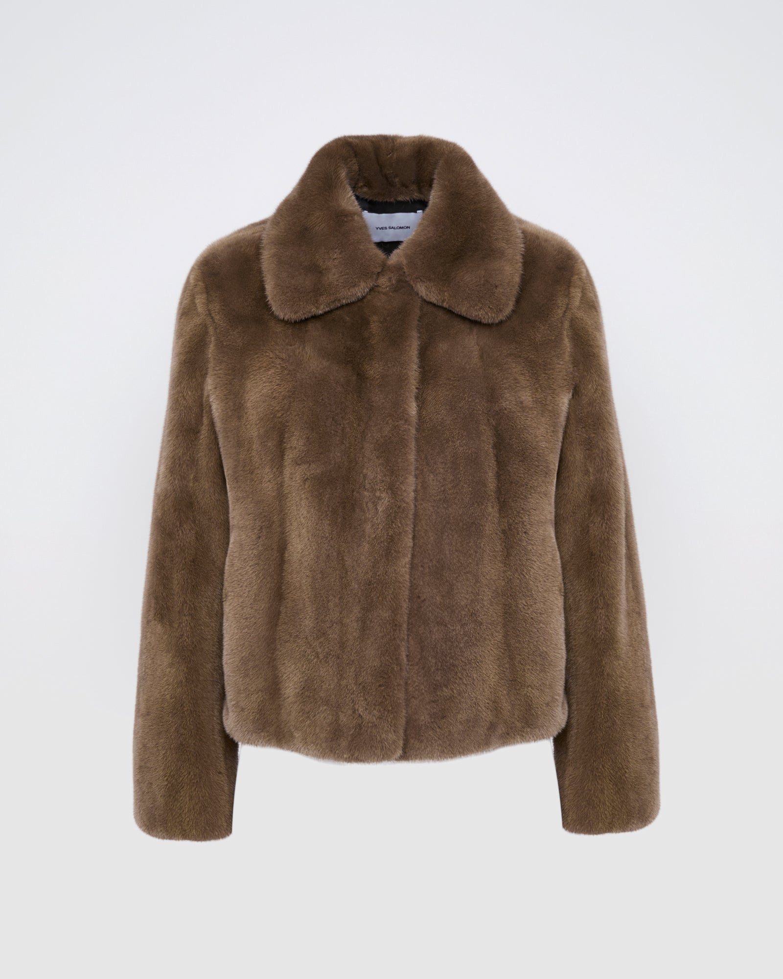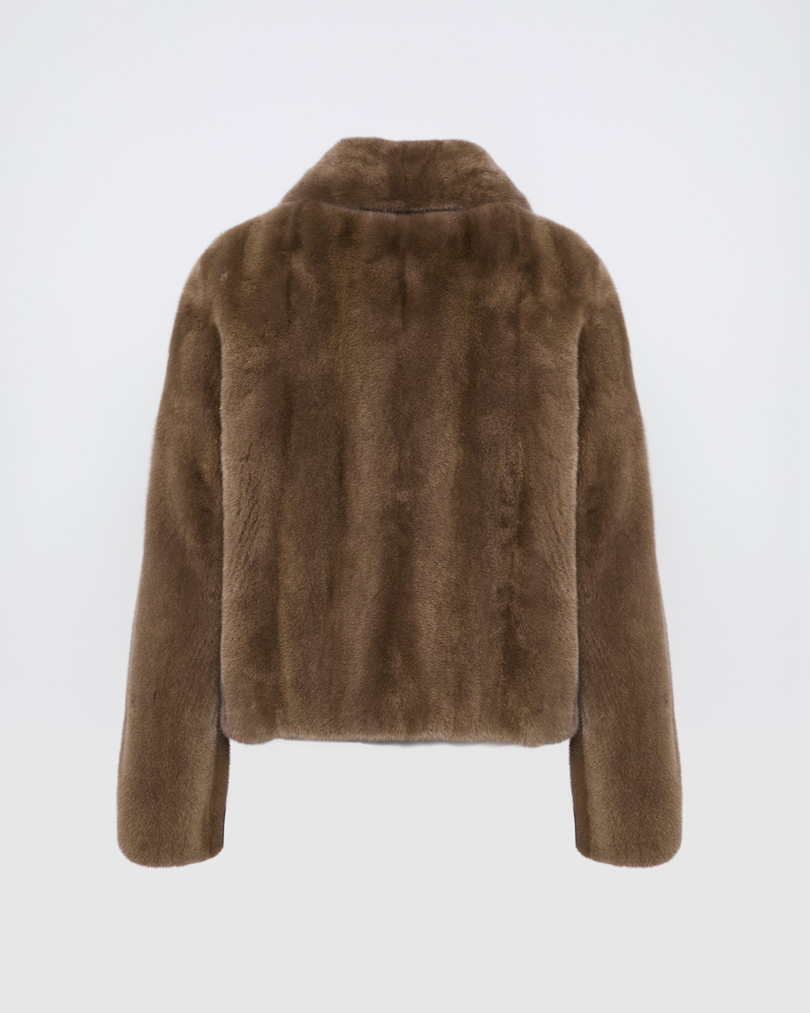 A short jacket in long-haired mink fur defined by its durability, brightness and natural elegance. Featuring a pointed collar, two slit pockets and a front hook-and-eye fastening, the cut is minimalist and the styling details are subtle. Warm and enveloping, this model is a winter essential for a timeless look.