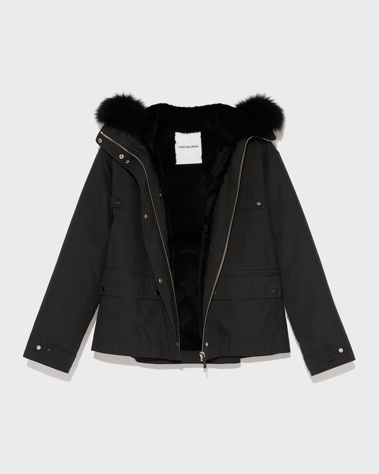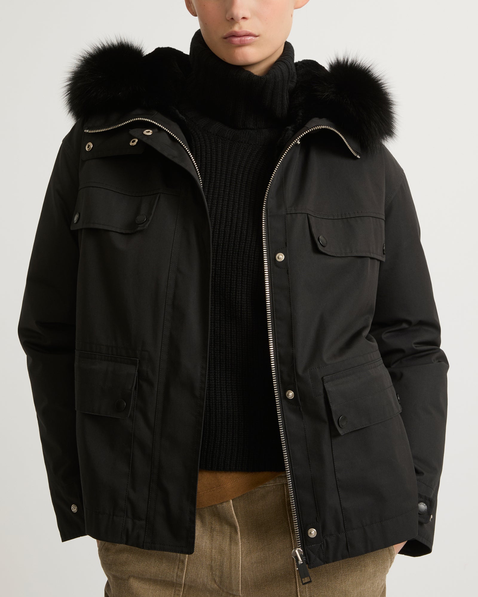 This parka in cotton/nylon mix borrows workwear codes for a short, zipped shape with four snap-fastened patch pockets on the front. The waterproof outer fabric hides a removable lining in luxuriously soft rabbit fur. The hood also features a removable fox fur trim. Lined with highest quality down, the sleeves end with ribbing at the wrist.