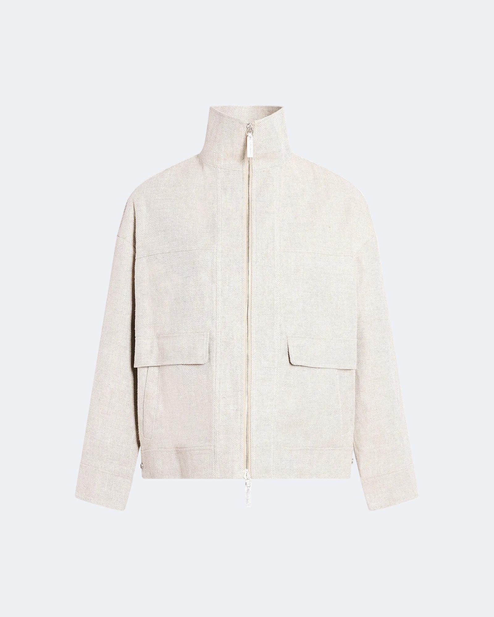 A contrast of fabrics for this sporty jacket, crafted from a highly resistant linen gabardine treated to resist wind and rain, which allows the unique texture of linen to provide a waterproof protection. Details in silver-effect lambskin leather add a touch of shine to the trim. Embossed inside logo and flap pockets with leather detail.