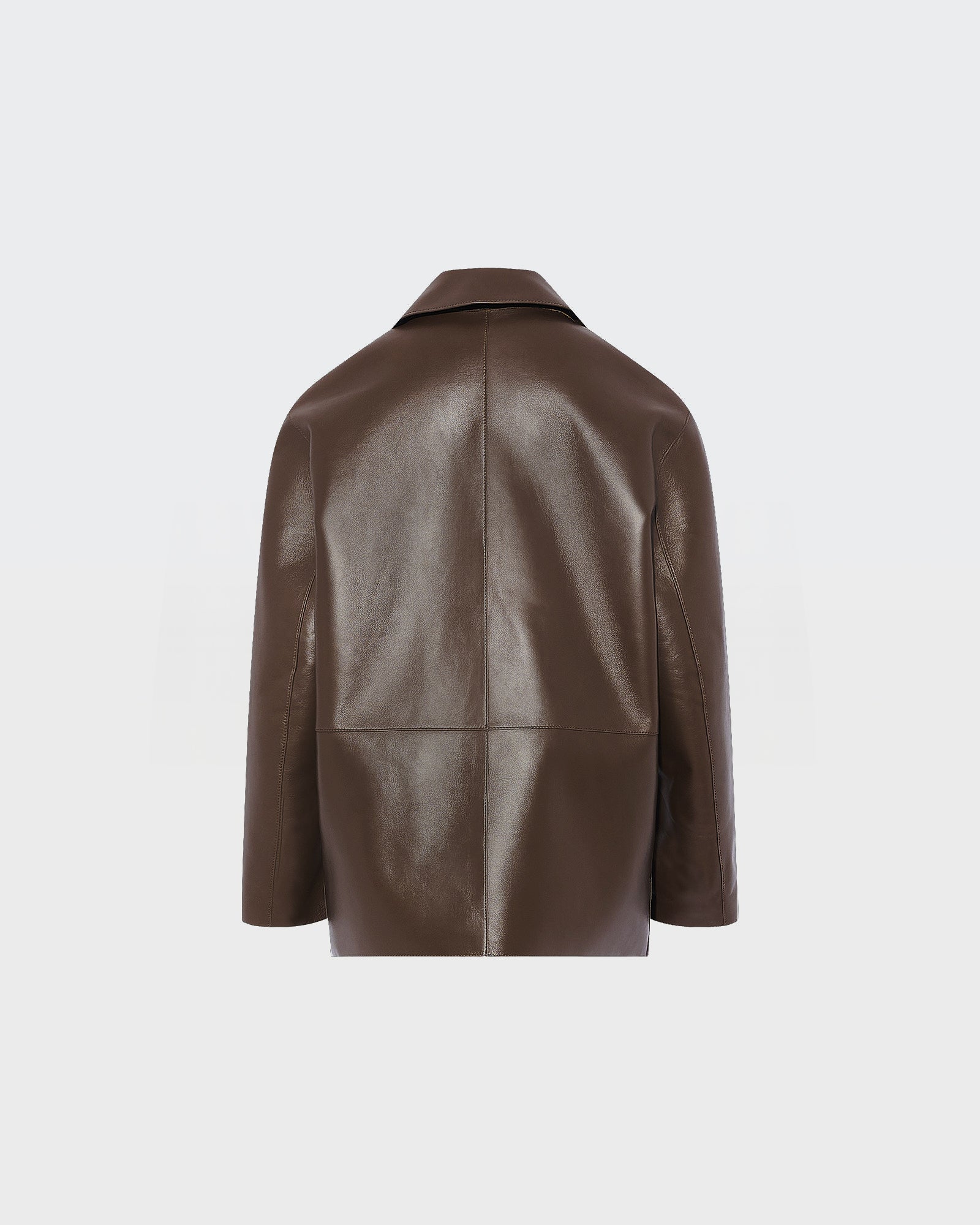 Smooth, shiny lambskin has been bonded with houndstooth fabric to create this slightly oversized jacket, with a shape reminiscent of a workwear overshirt. The fabric technique allows for a lighter, more elegant feel. Two flat pockets, front button fastening.
